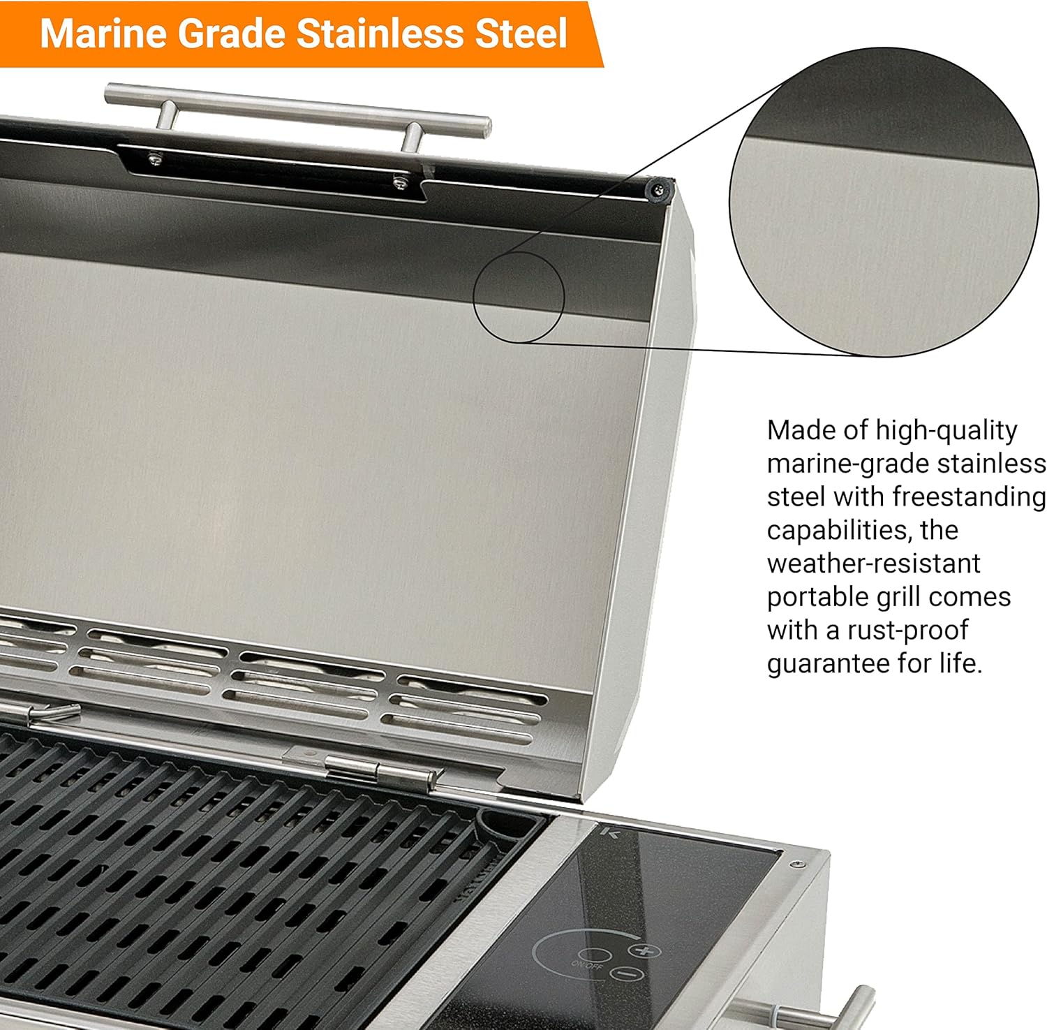 - Stainless Steel Grill: This portable electric power grill is a great addition to any cooking arsenal. Made of high-quality marine-grade stainless steel with waterproof digital touch control, it comes with a rust-proof guarantee for life.