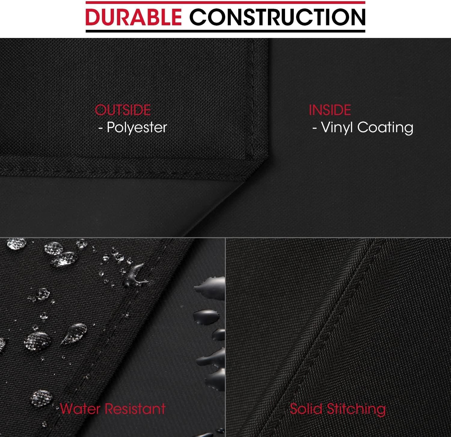 - 【Upgraded Material】- New special fade resistant fabric with vinyl coating, water repellent processed, the new material exhibits superior colorfastness, resists UV, repels rain, resists tears and cold cracking, durable and long-lasting, gives your grill all year round protection against sun, rain, snow, hail, wind, dust, dirt and etc.