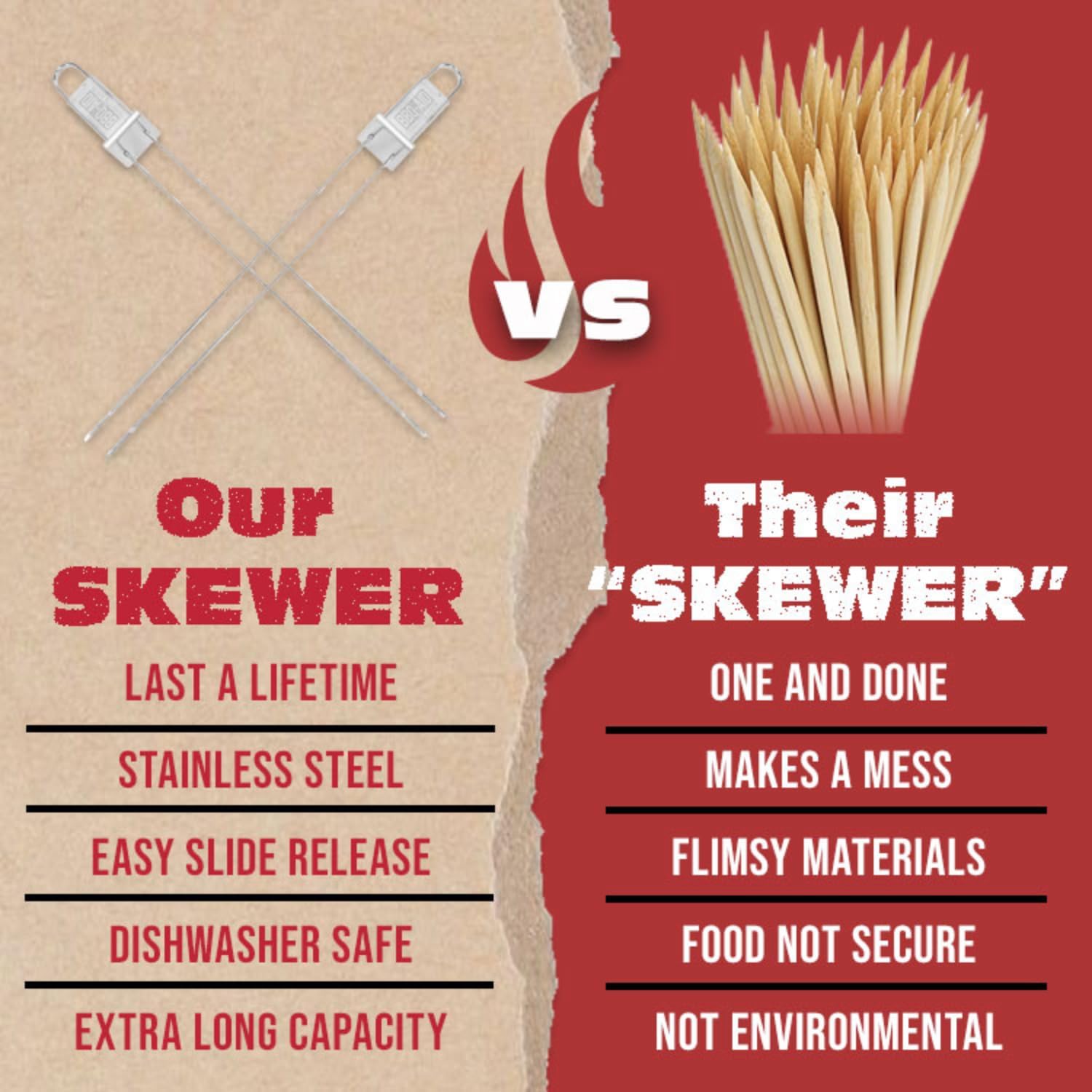 - 13-INCH LONG SKEWERS β Pack in as much meat as you can and easily remove all food with our integrated slider and long stainless steel skewers for grilling