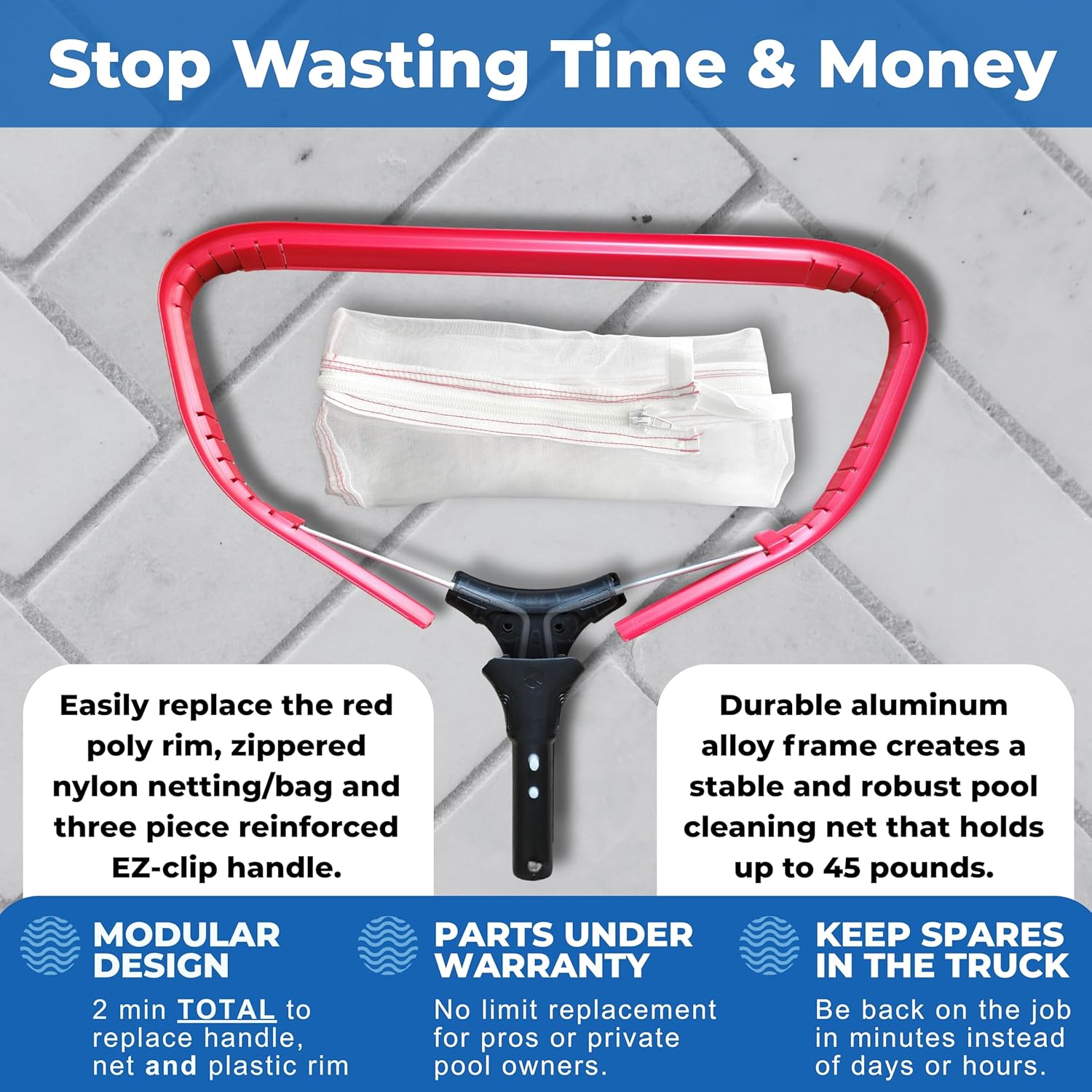 - NEARLY ELIMINATE DOWNTIME DUE TO BROKEN TOOLS - Keep an unlimited number of your fine mesh pool silt net part replacements (handles, nets, rims) in your truck (all at half off retail) for quick and easy on-site tool repairs. Stay on the job, making money and working hard for your clients.