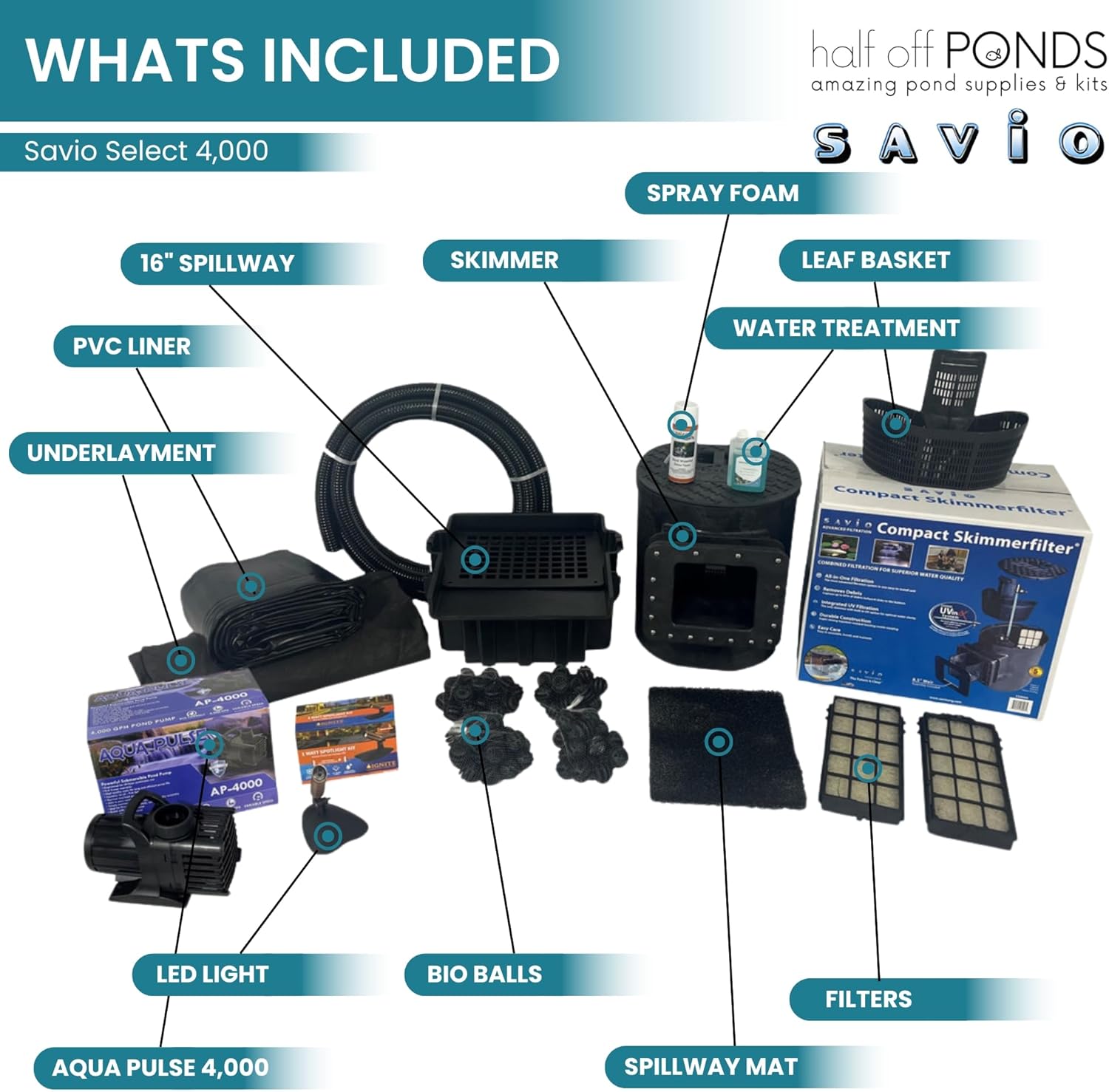 HALF OFF PONDS Savio Select 4,000 GPH Submersible Pump Pond Kit with 20' x 25' PVC Plastic Pond Liner for Water Garden & Koi Pond