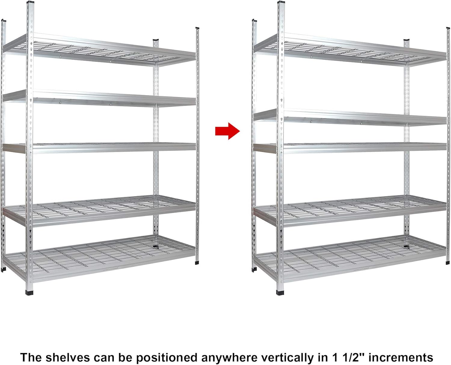- Storage Unit dimensions (Together) β 24" W x 60" L x 78" H | Storage Unit dimensions (Separated) β 24" W x 60" L x 39" H | Shelves adjustment (Up & Down) β 1.5β increments | One single shelf can hold up to 800 lb, and the whole shelving unit can hold up to 4000 lb (when evenly distributed and on a level surface)