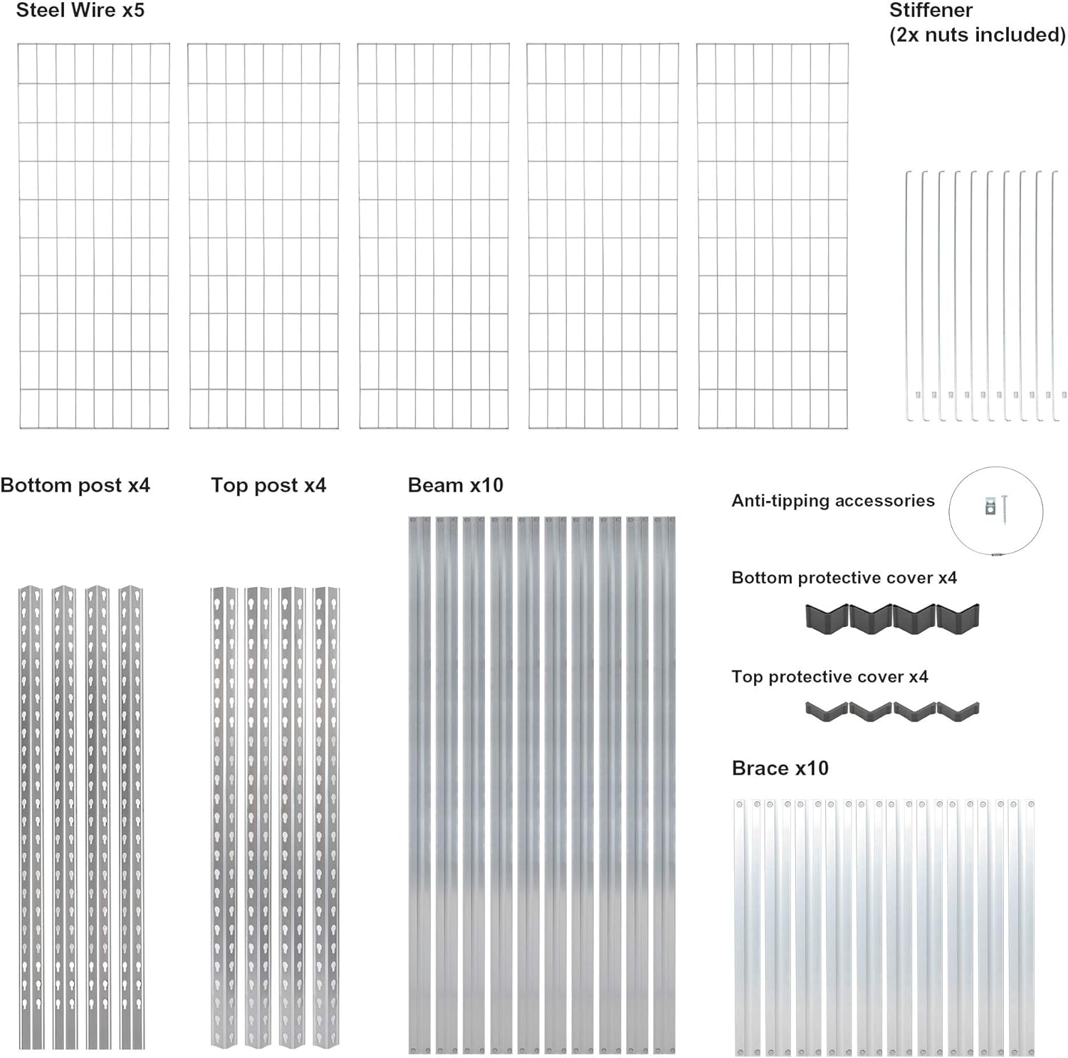 - One double post (vertical or horizontal) heavy duty storage shelving unit with assembly Instructions and anti-tipping accessories