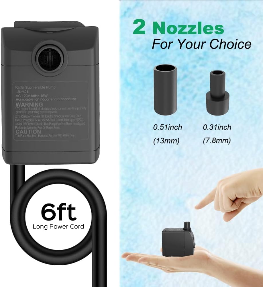 - 【MULTI-OCCASIONS】This fountain pump can make circulation to your tank and give your lovely fish a near-natural environment. This submersible water pump could create water current, ideal for a medium-sized aquarium, small pond, water garden, and desktop water fountains. Perfect for backyard fountain/waterfall, aquarium, ponds, fish tank, tabletop fountains, garden statuary, patio drip irrigation system and hydroponic systems and more.