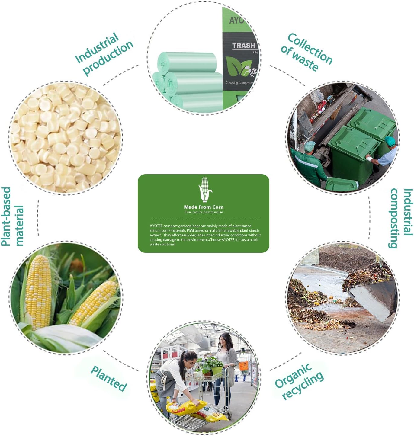 - Compost Trash Bags: The main materials for our small trash bags are made of Plastarch material(PSM), which is based on natural renewable plant starch extract. compostable, meets ASTM series standards. These small compost bags can be rapidly degraded in municipal industrial composting facilities (at 50-60ยฐC constant humidity), to avoid harm to the environment