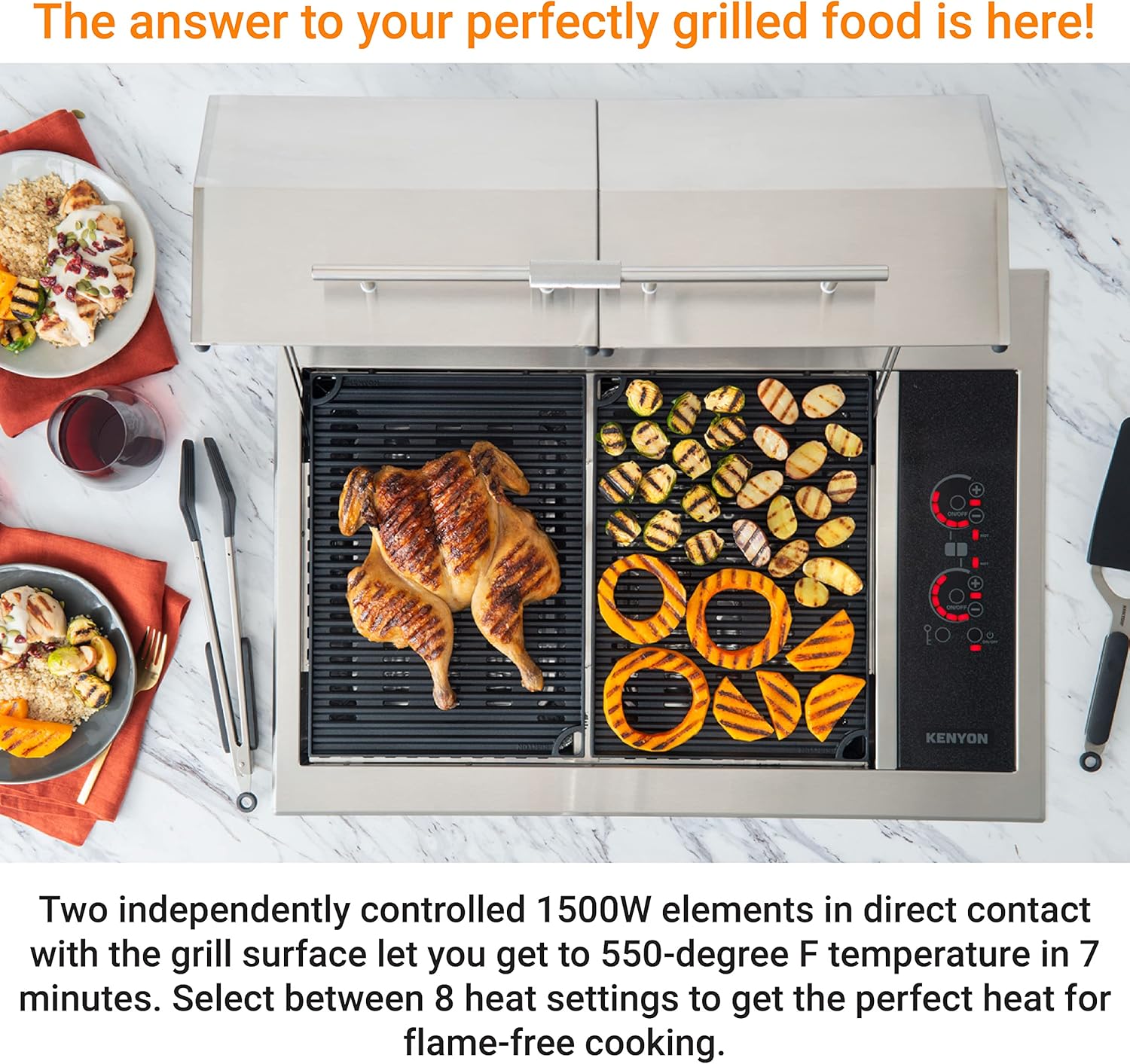 Kenyon Texan Built-In Electric Grill for Stone Counter, Standard Lite-Touch, Stainless Steel Grill with Split Lid for Indoor and Outdoor Use, 2 Burners, Quick Heat Up, Dishwasher Safe Grate, 240V
