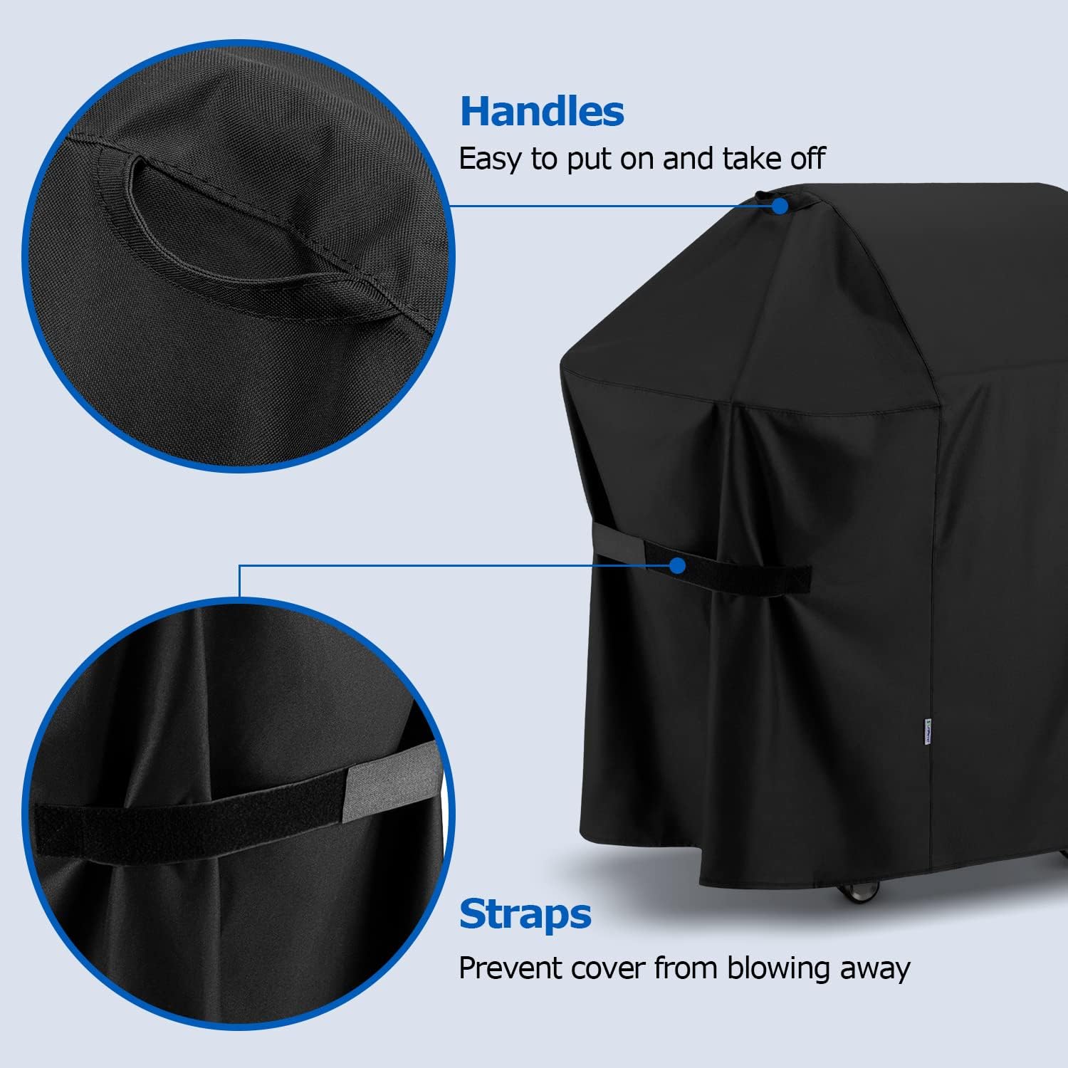- Convenient Handles - Two useful fabric handles on top of the barbecue gas grill cover make it easy to put on and take off from the BBQ grill, also can be used as loops to hang up at side when not in use.