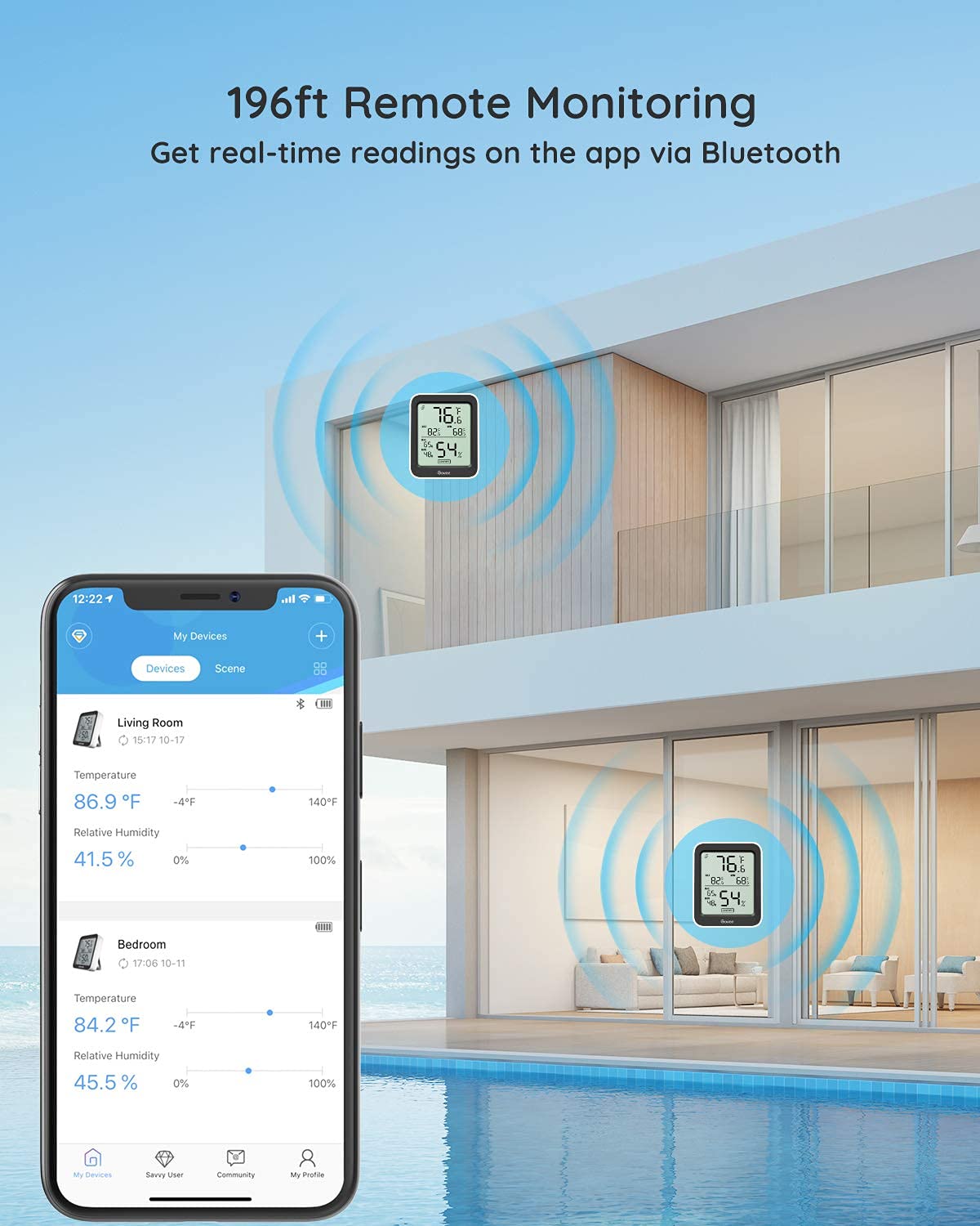 - Easy to Use: Simply download the Govee Home app, search for and select H5075, and pair the room thermometer hygrometer successfully within minutes. With a 196ft/60m Bluetooth range, you'll be notified of any temperature humidity changes immediately.