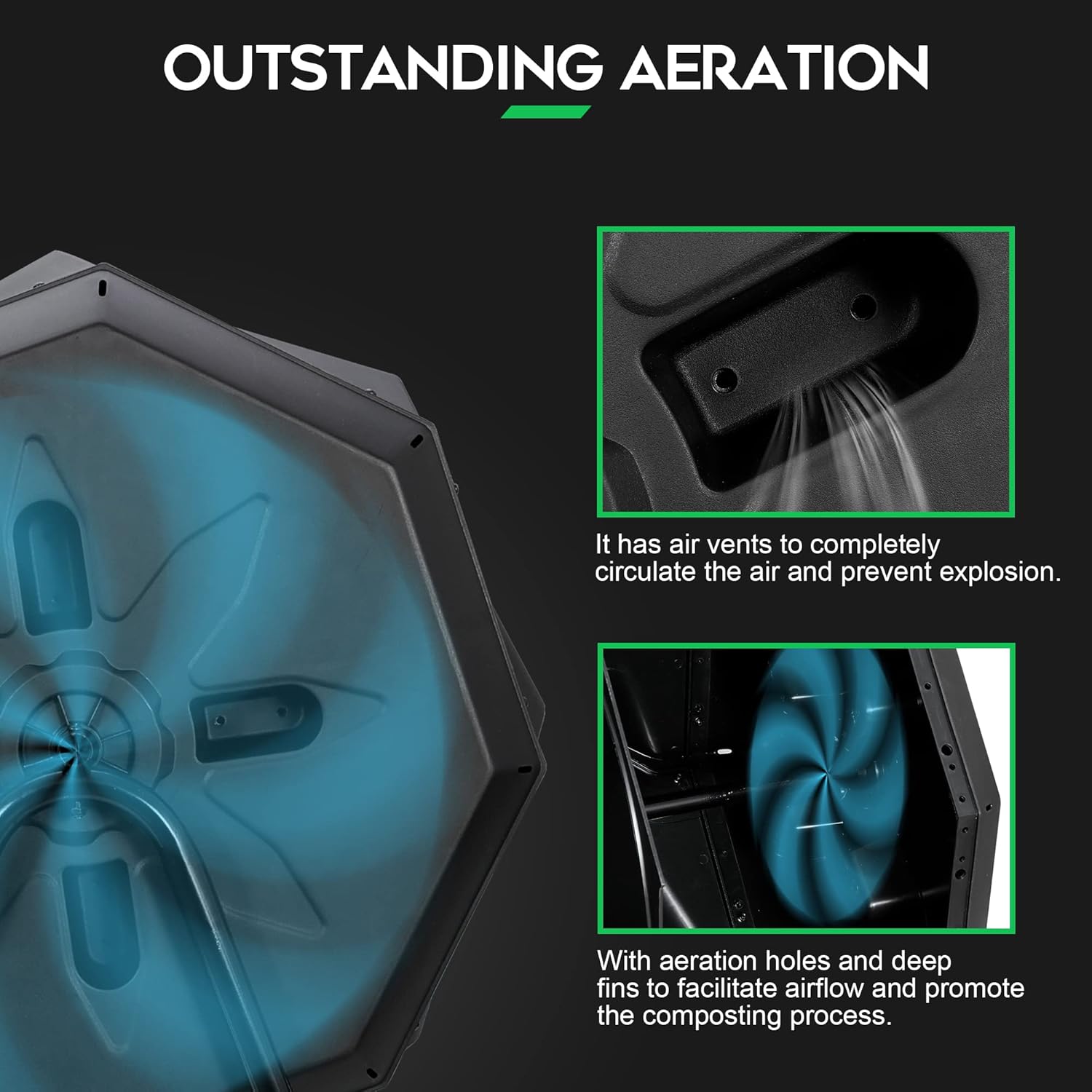 - 【Convenience Aeration System】--The strong compost barrel features aeration holes as well as deep fins to break up clumps inside the chamber and mix lots of oxygen into the compost, please make sure that you have all the tabs in the holes as well or the panel won't make a flat seam. Easy to use as the openings are divided, just slide the door open to add the compost material and slide shut