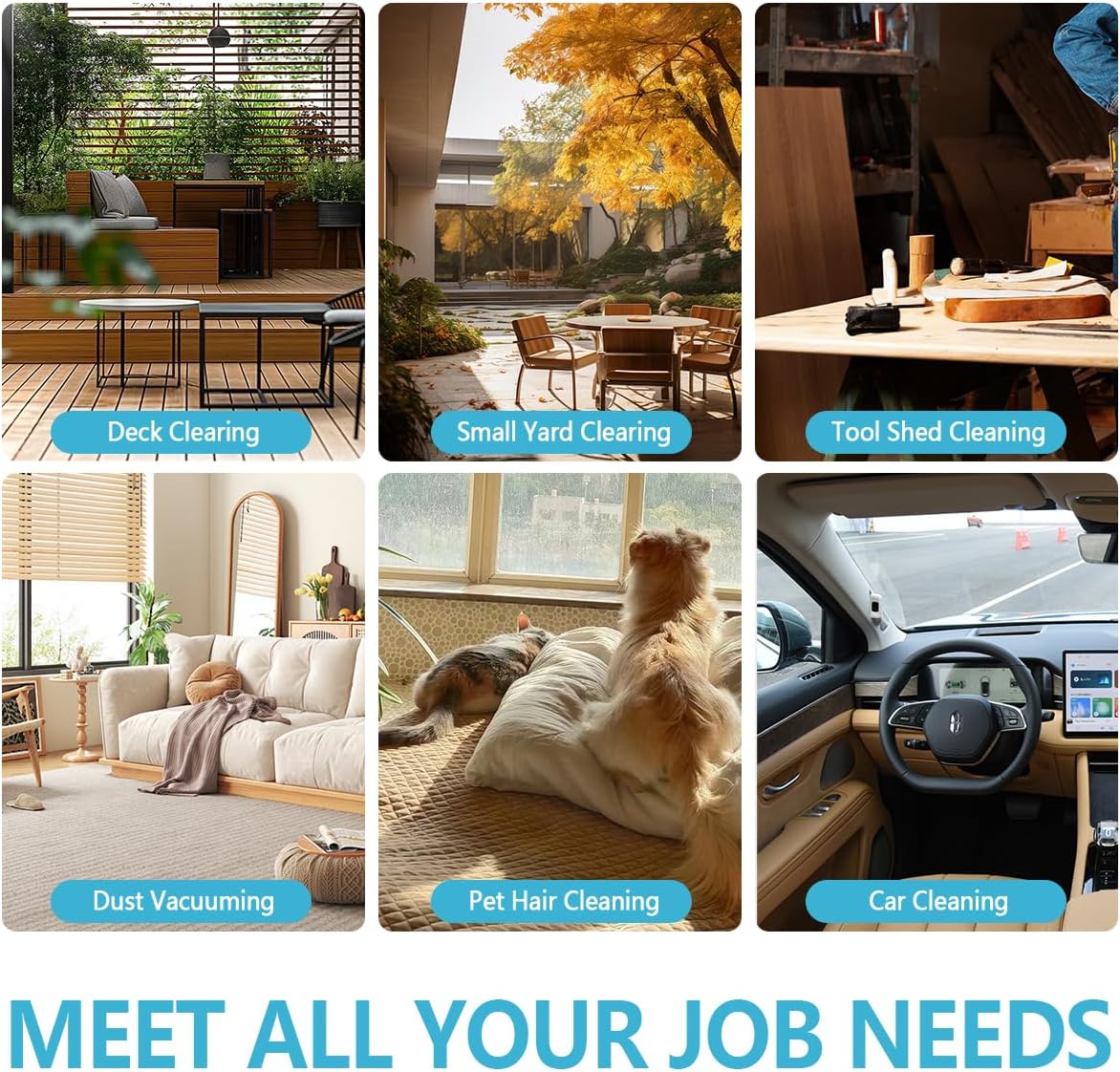 - Instantly Becomes a Vacuum Cleaner:As long as the blow tube installed in the air inlet, put the garbage bag at the air outlet, the blower will become a vacuum cleaner immediately;Super strong suction allows you to absorb dust, pet hair, crumbled cookies, biscuits much more easily than a besom; It brings you a better cleaning experience
