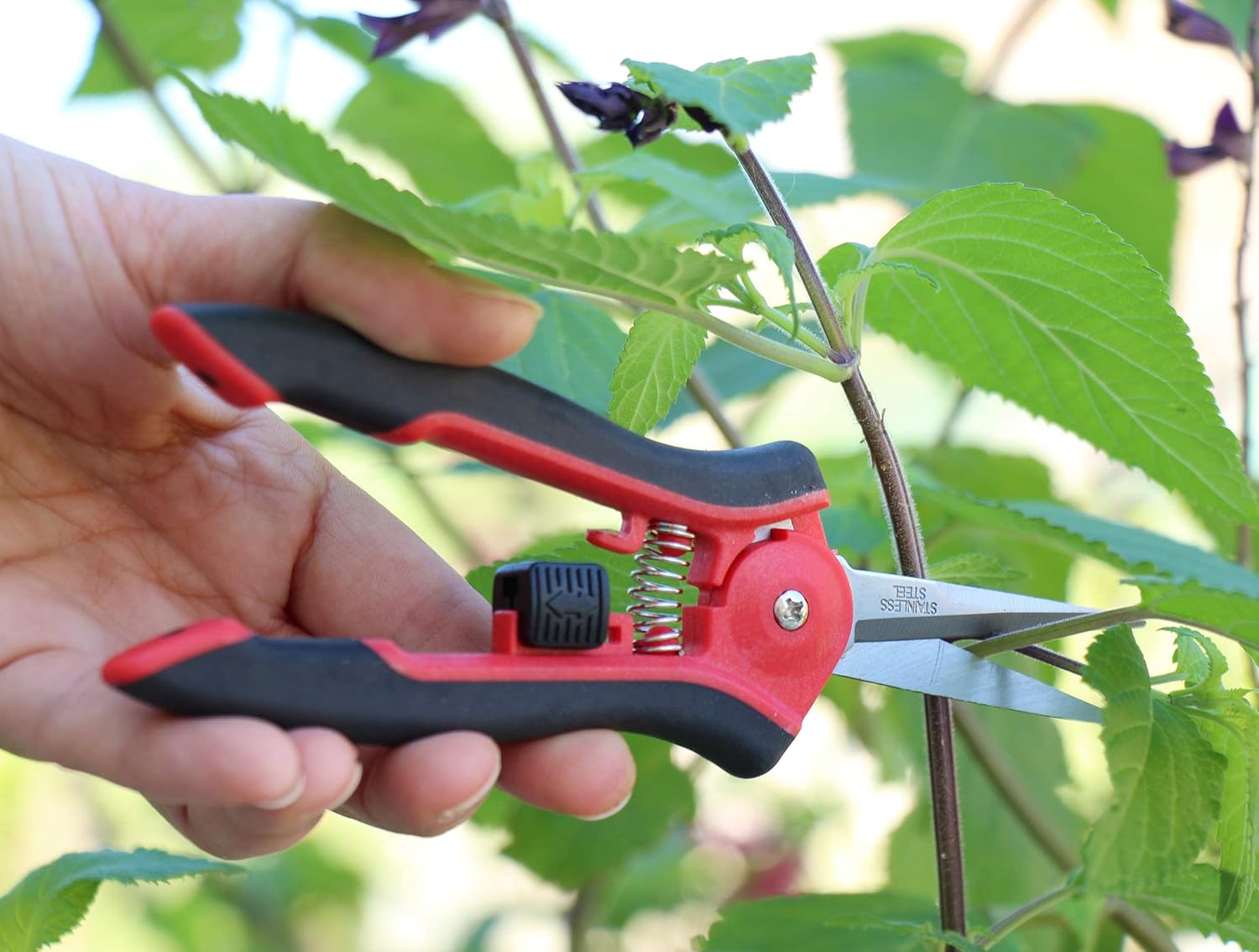 - STAINLESS STEEL BLADES WITH MICRO TIP: The corrosion-resistant 6 1/2" carbon steel blades prevent rusting and are easy to clean. They are fully hardened and stay sharp, even though heavy use. The precise blades cut to the tip for clean, healthy cuts on plants in tight spaces. Non-stick coating helps reduce jamming and buildup of sticky resin.
