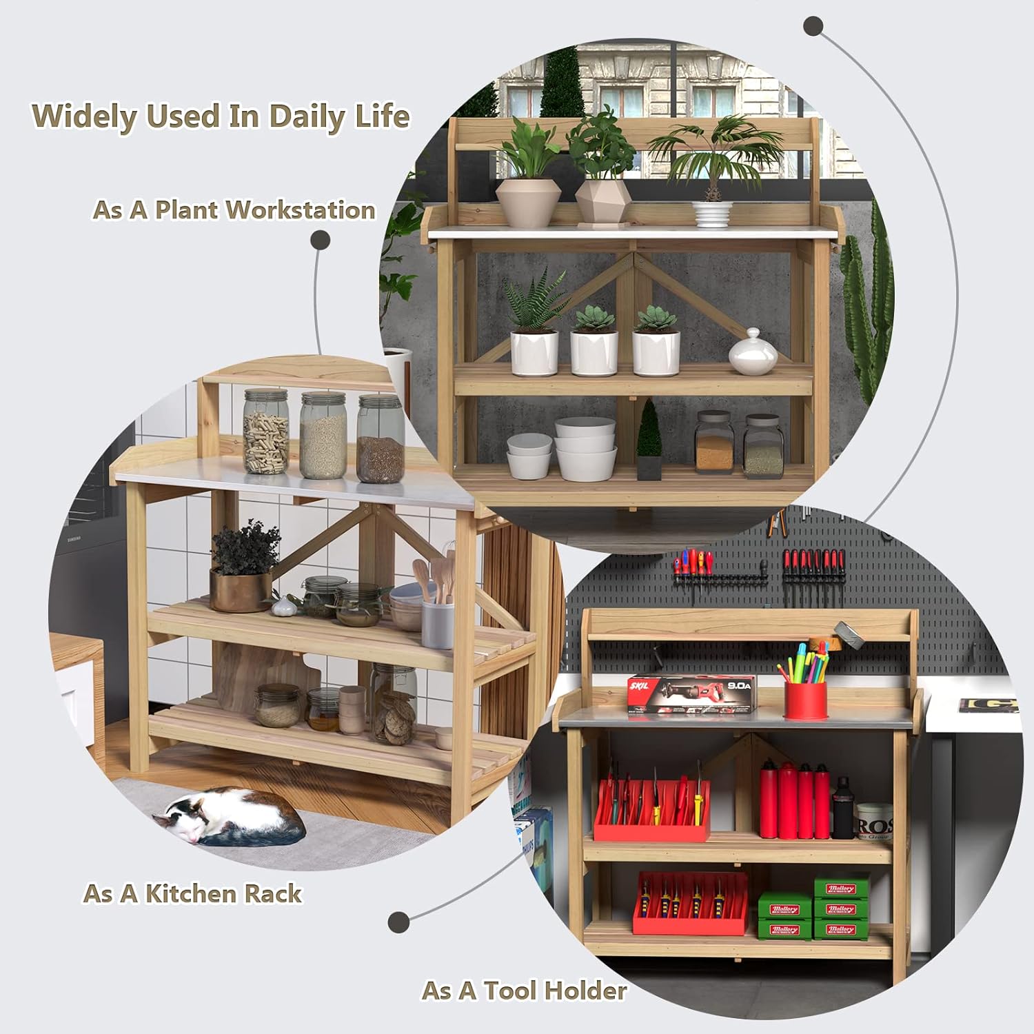 S AFSTAR Garden Potting Bench, Gardening Work Station Table with 2 Storage Shelves, Fir Wood Structure and Metal Tabletop, Gardening Table Potting Benches for Outside Backyard Balcony