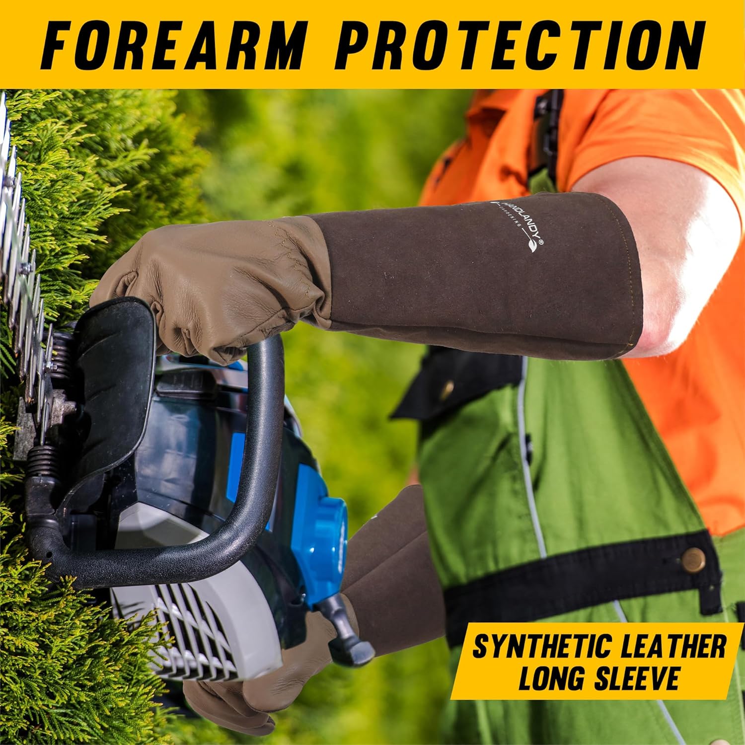 HANDLANDY Long Gardening Gloves for Men & Women, Cowhide Leather Rose Pruning Gloves- Breathable & Durable Gauntlet Glove (Large, Brown)