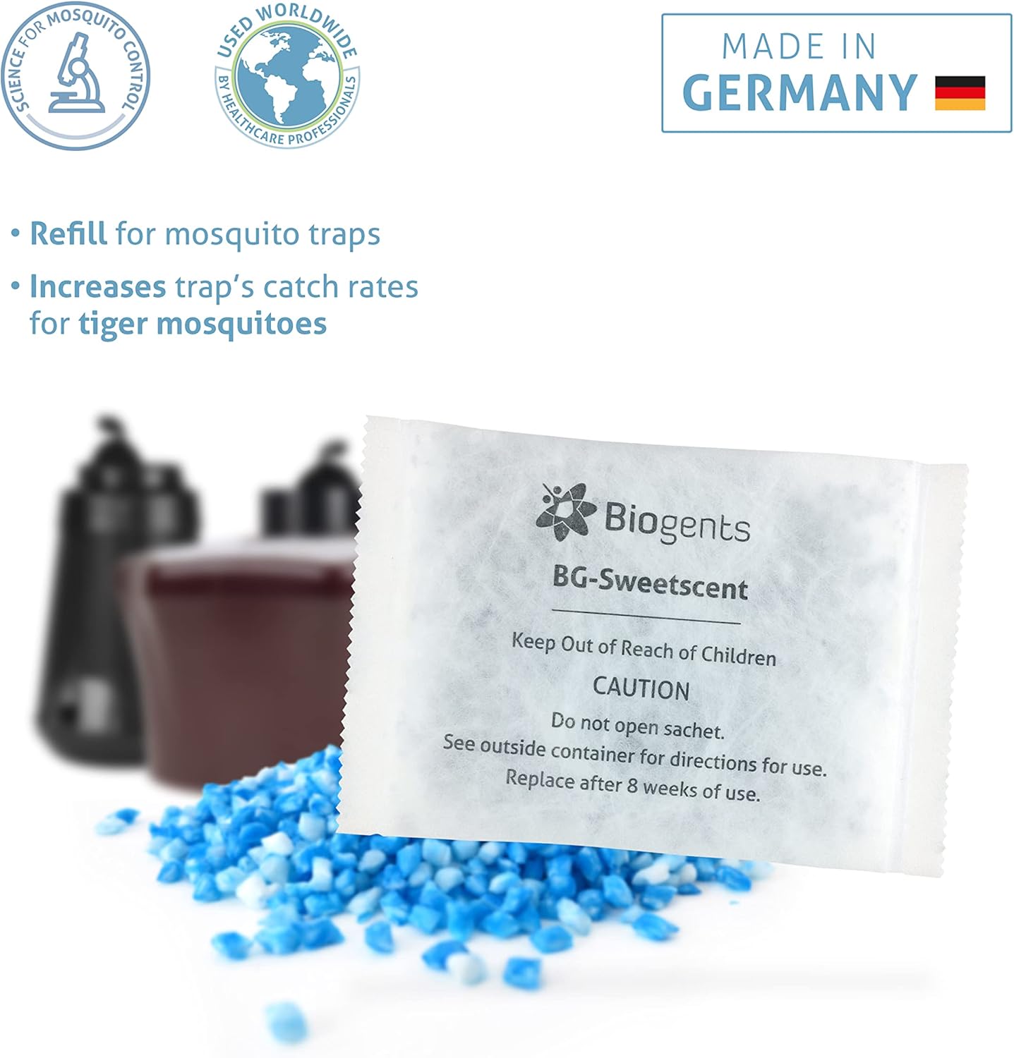 - PACKAGE CONTENTS: This contains ONE pack of BG-Sweetscent attractant, for use in the BG-Mosquitaire, BG-Home, and other commercial traps. One pack is required per trap. For best performance use with Biogents traps.
