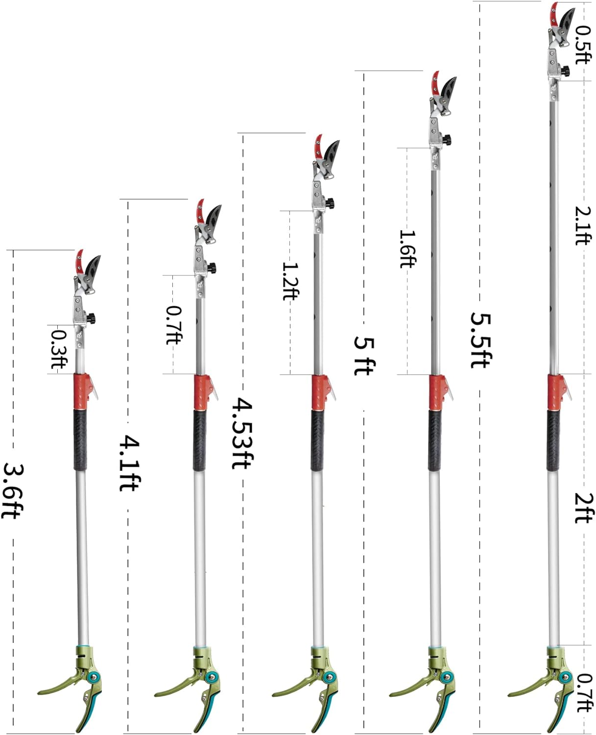 - [Extendable Length] The pruners pole is creatively designed to extend from 3.67-5.45 feet which allows an added 3 to 5 feet reach for climbers, trees or hedges which are 10 feet high for trimming or cutting purpose.