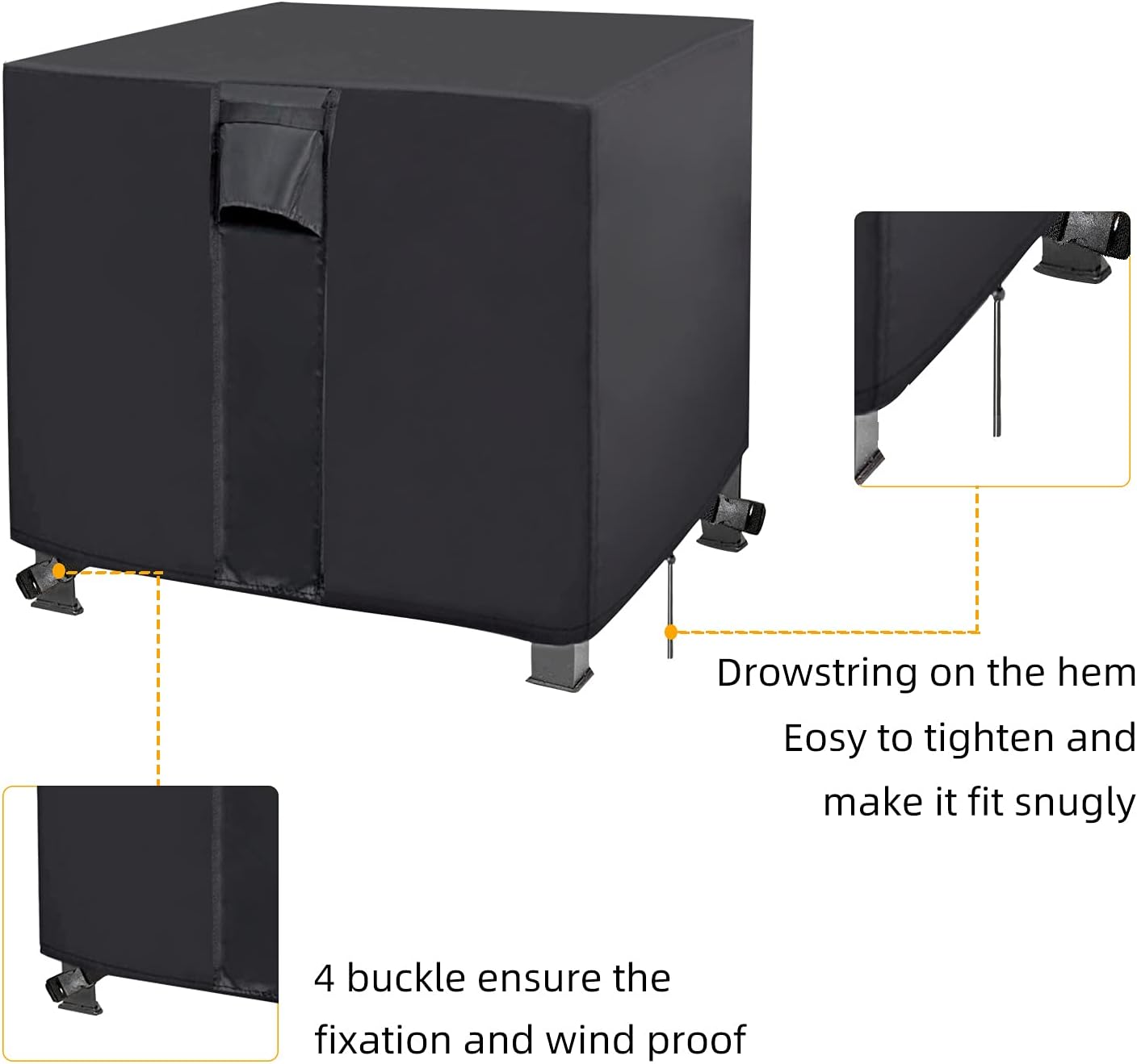 - [RIP RESISTANT AND UV PROTECTION]: Elastic hem cord and straps allow for a custom secure fit. Fire pit cover round 4 built-in buckle straps on on diagonal sides to lock around the fire pit legs, make the cover stay firmly in strong wind, especially in severe weather. Add with Air Vent and Handle. Plus the design of air vent and handle, help the internal air circulation, make it more convenient for you to use