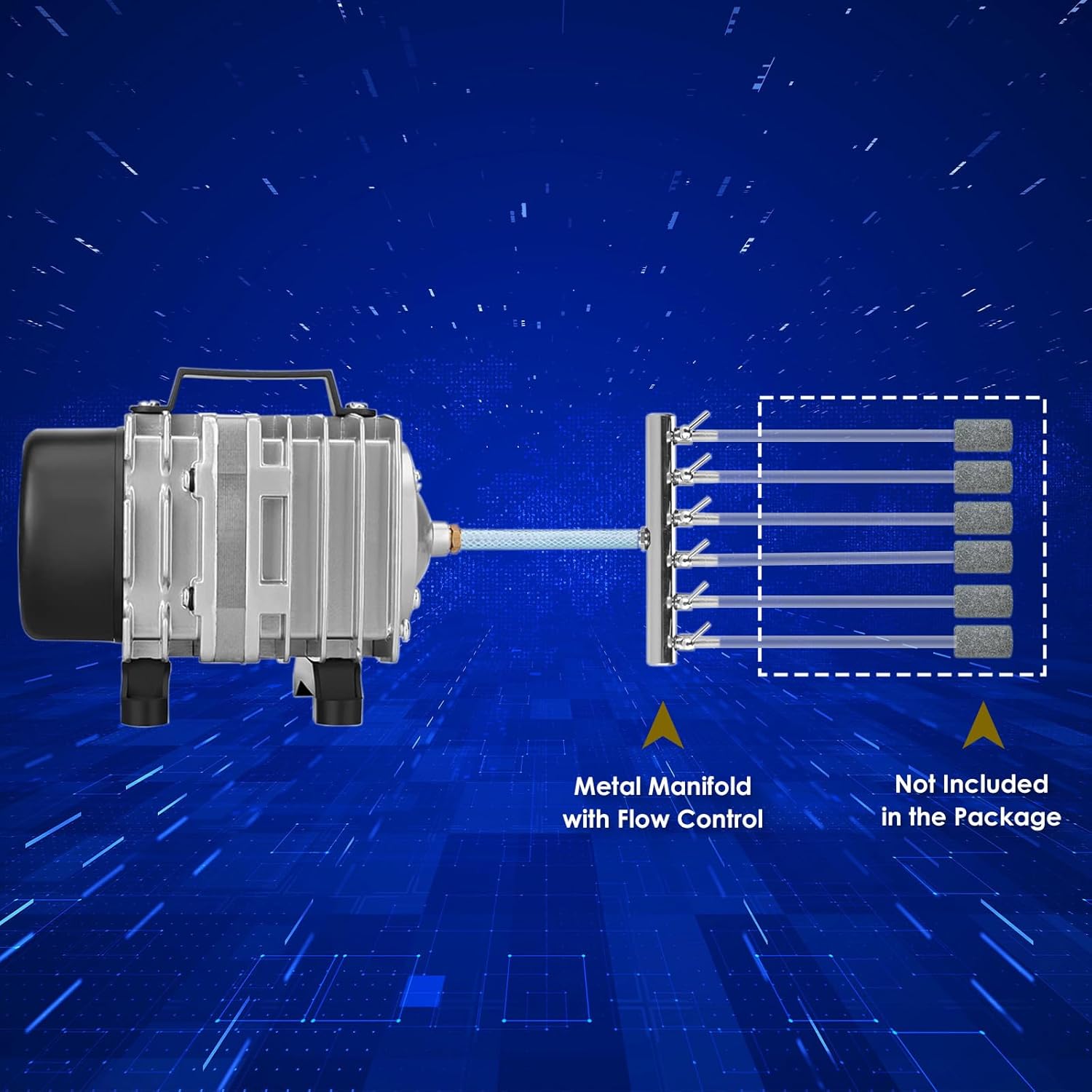 - ACCESSORIES – A short piece of hose and a 6-outlet volume adjustable metal manifold are included in the package of this pond aerator to facilitate the application. Users only need to buy 3/16” standard airline tubing and air stones to start the operation.