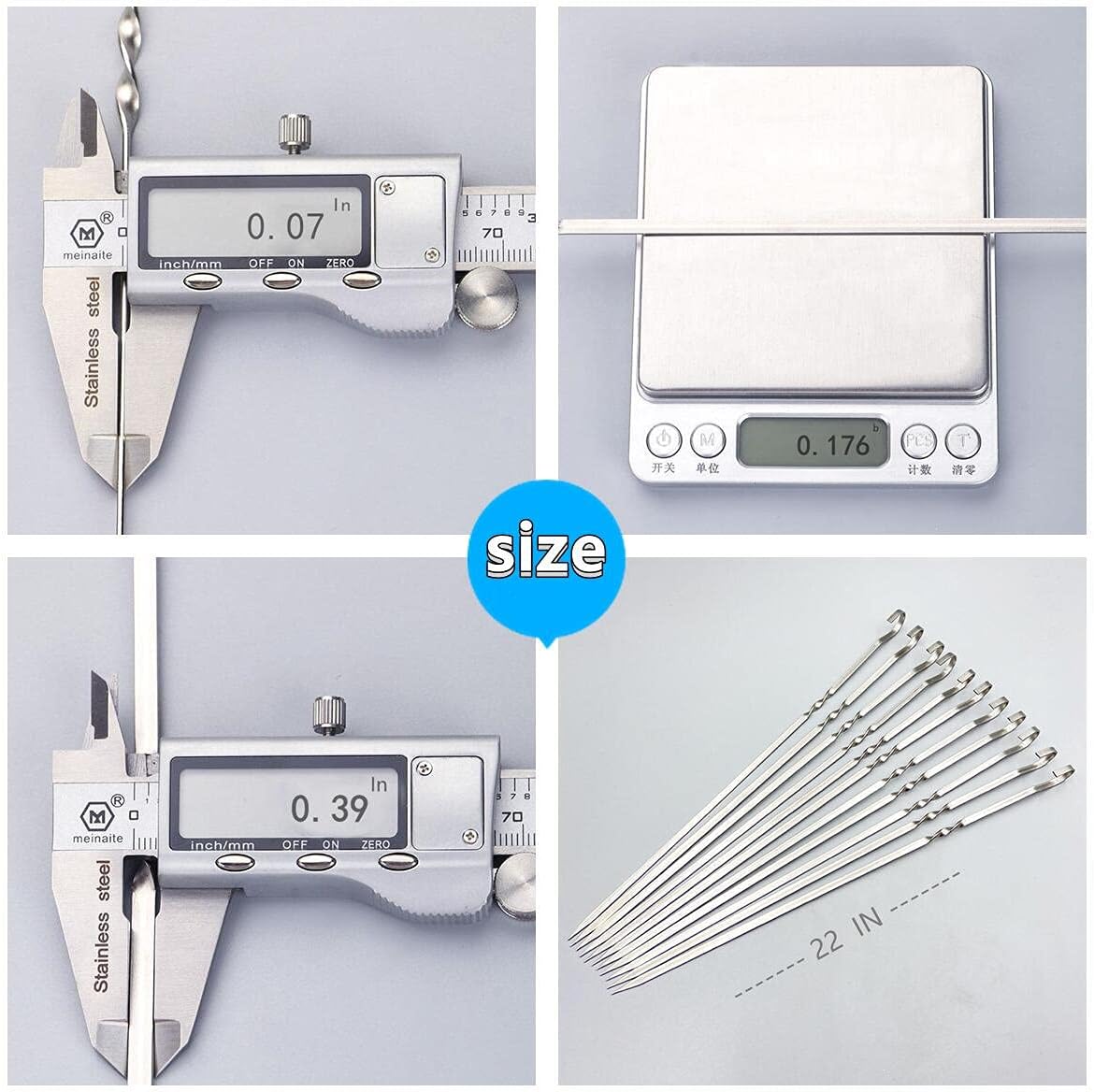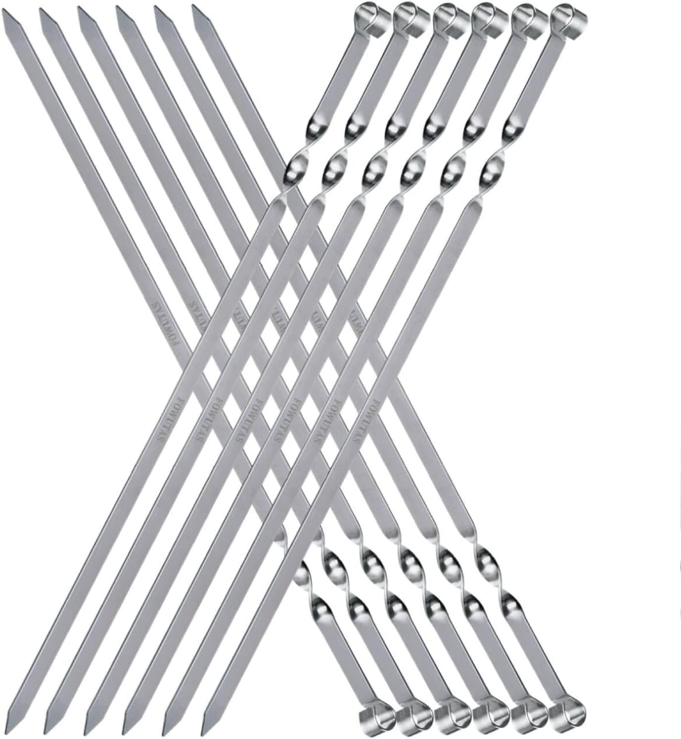 - LONG AND WIDE KEBAB SKEWERS:The length of our Flat kabab skewers is 22 inch. Product Details:The handle portion is about 3.6 inch;the twist portion is about 2.8 inch;The food placing portion is about 15.6 inch.The barbecue skewers width is 0.39 inch ;The barbecue skewers thickness is 0.07 inch