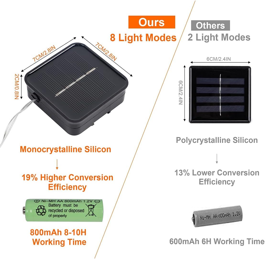 - 8 Lighting Modes with Memory Function: Our solar fairy lights for outside waterproof have 8 lighting modes for you to choose: combination, in waves, sequential, slo glo, chasing/flash, slow fade, twinkle/flash, and steady on. Comes with memory function, remember last setting automatically after turn off the power, no need to reset again.
