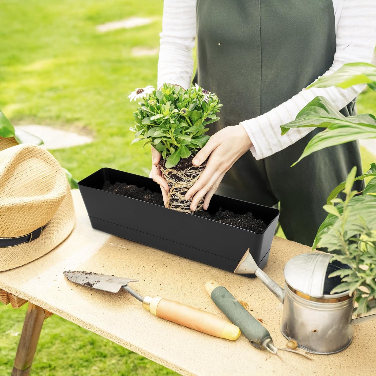 GREANER 3PCS 16x3.8 Inch Window Boxes Planters, Black Rectangle Planters Box with Drainage Holes and Trays, Herb Succulents Flowers Plastic Pot for Windowsill, Garden, Balcony, Indoor, Outdoor Decor