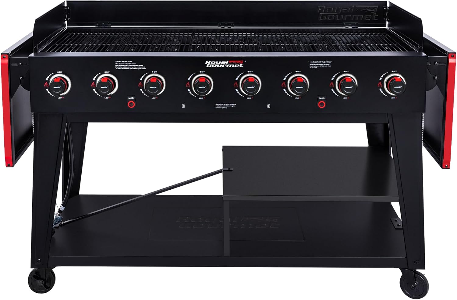 - Large Event Grill: Porcelain-enameled steel wire cooking grates boast 947 sq. in. cooking space, and eight stainless steel burners deliver 104,000 BTU cooking power (13,000 BTU each)