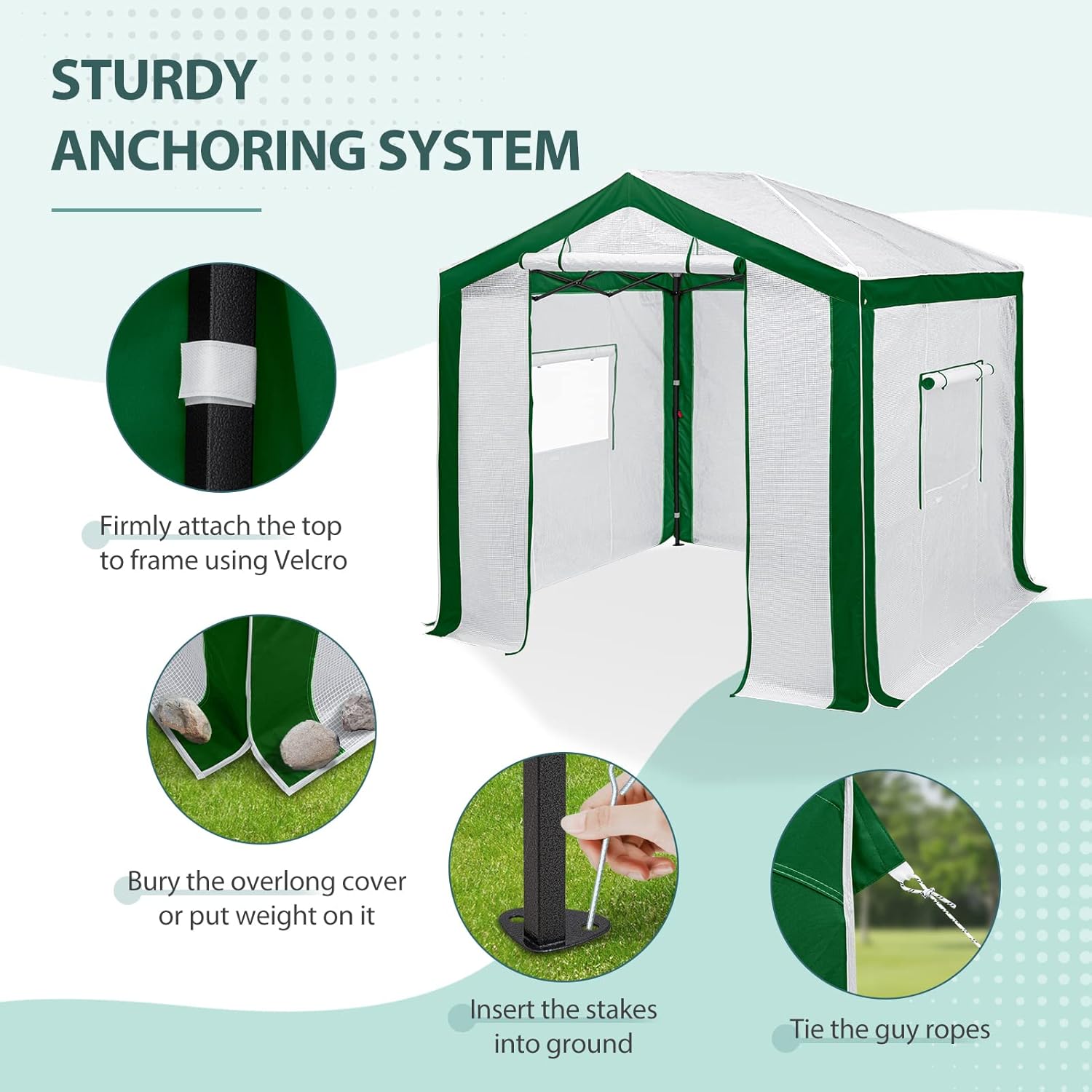 - PLANT PROTECTION: The clear, scrim reinforced, PE cover allows ample sunlight to pass through to your plants to keep them healthy. The doors and window flaps can be rolled up on warmer days to allow proper ventilation and air circulation and closed quickly to help retain heat