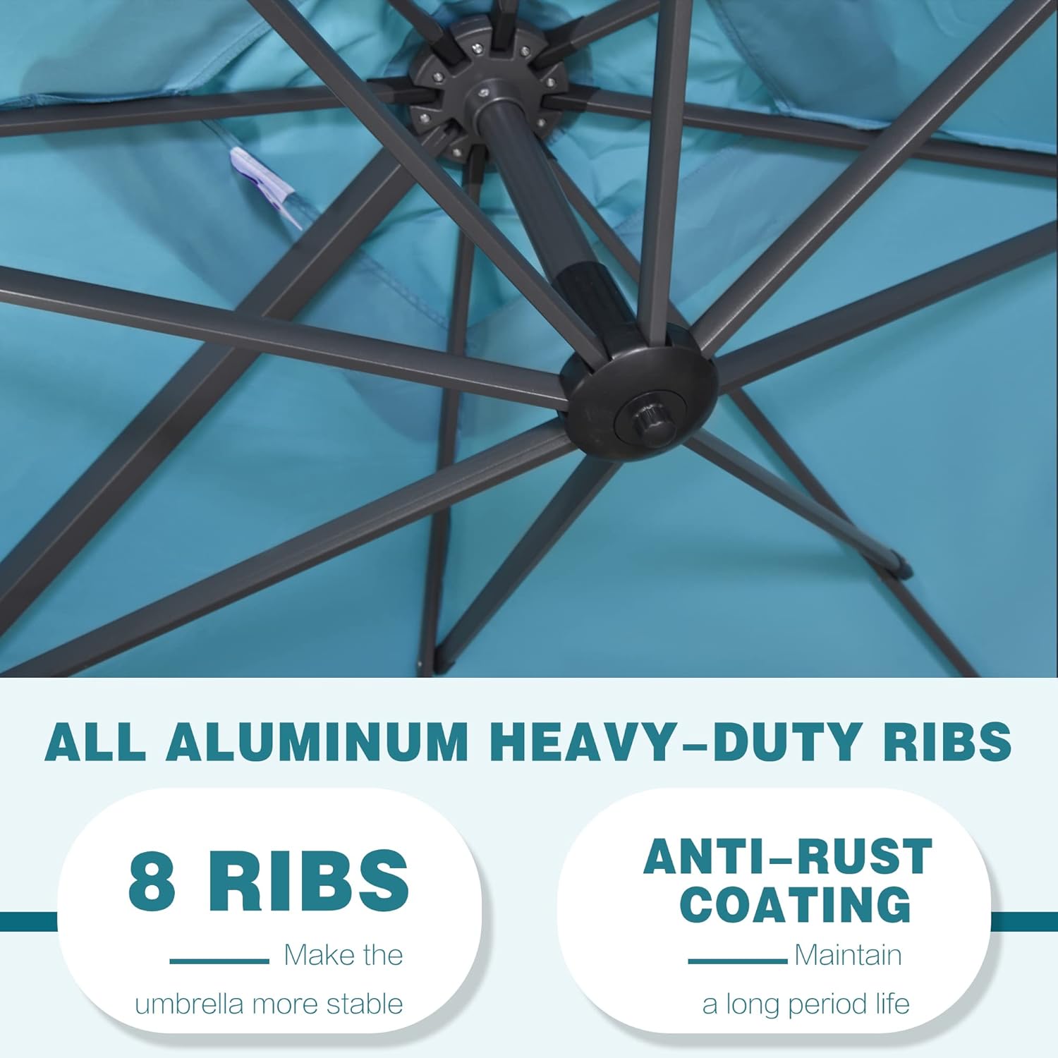 - All-aluminum umbrella bones and 8 heavy-duty ribs, anti-oxidation spray painted, maintain a long period life