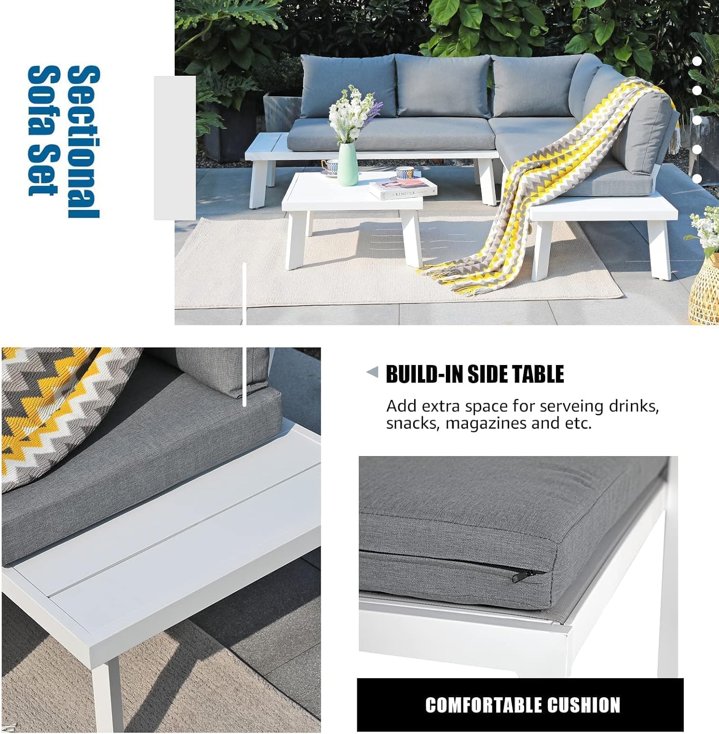 Soleil Jardin 4-Piece Outdoor Patio Furniture Set L-Shaped Aluminum Sectional Sofa with Coffee Table All-Weather Patio Conversation Set with Cushions, White