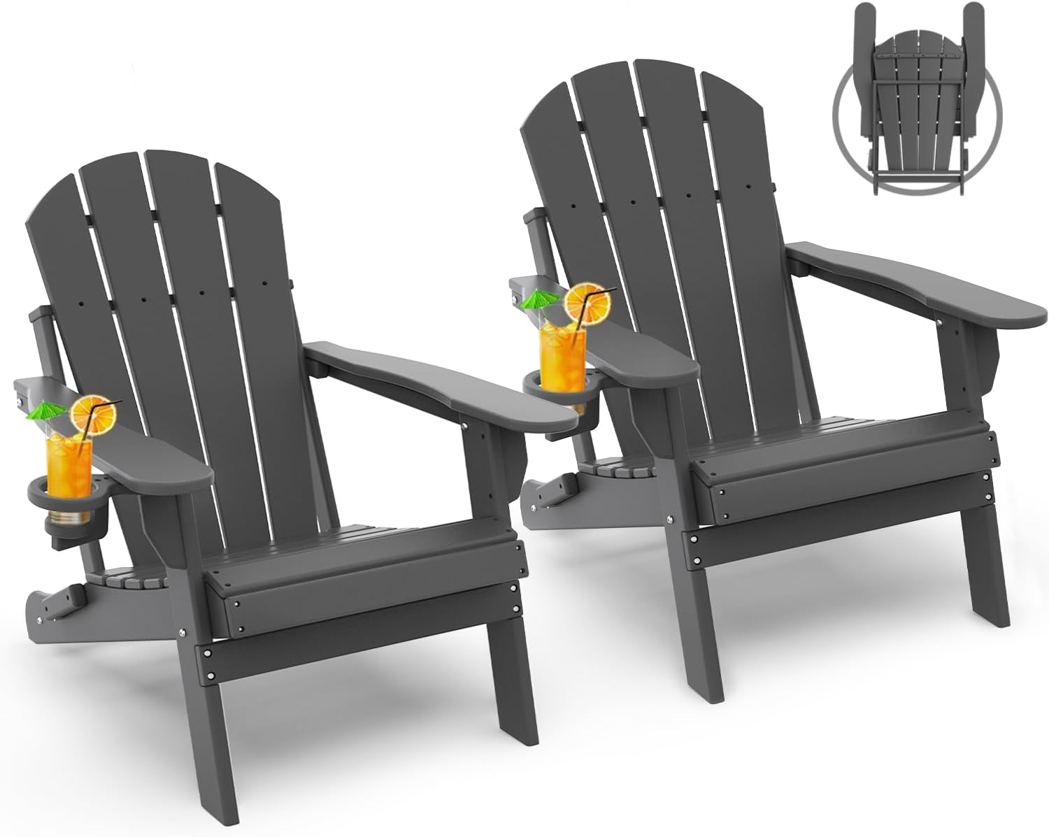 GREENVINES Folding-Adirondack-Chairs-Set-of-2 | HDPE Plastic | Fire Pit Chair | All Weather | Cup Holder | Grey | for Deck Backyard Patio Outdoor Garden