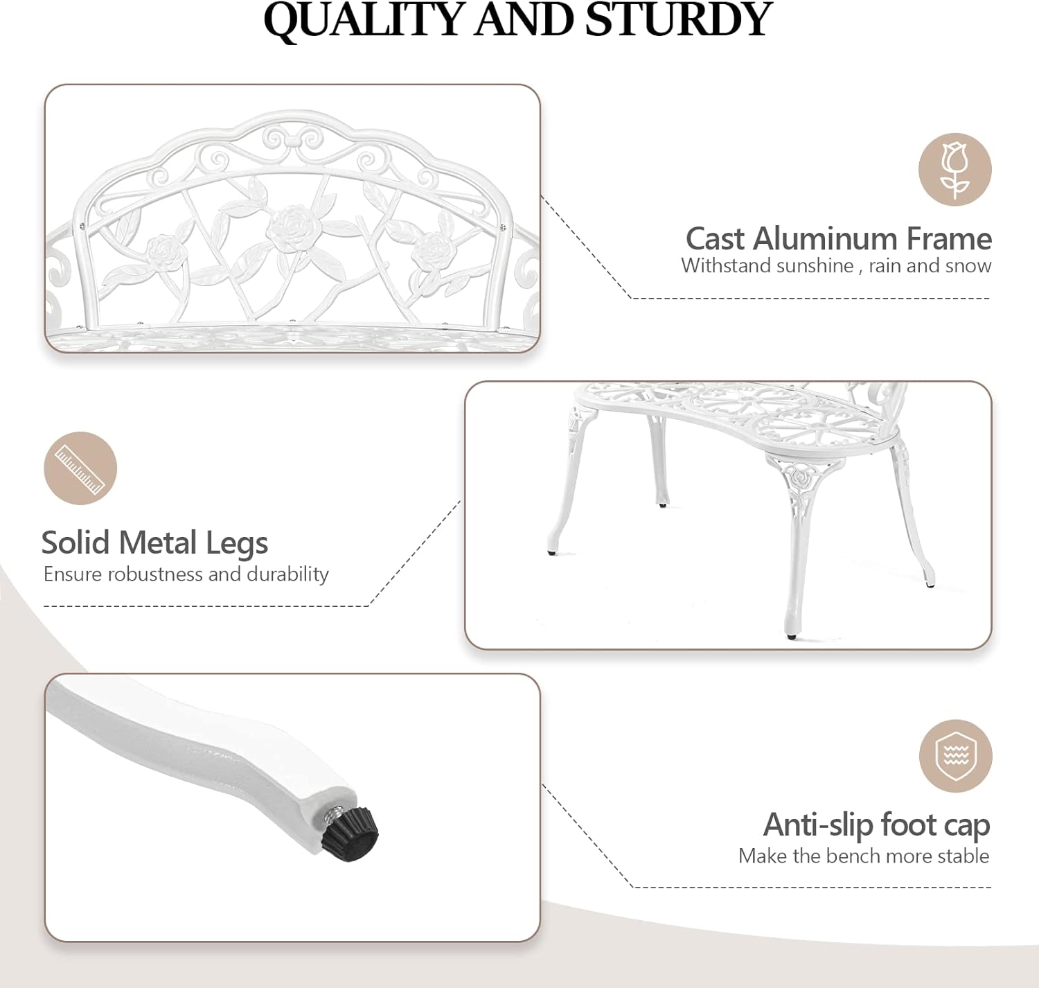 VINGLI 38.5" Patio Park Garden Outdoor Metal Rose Bench,Cast Iron Cast Aluminium Frame Antique Finish Chair,Accented Lawn Front Porch Path Yard Decor Deck Furniture for 2 Person Seat(White