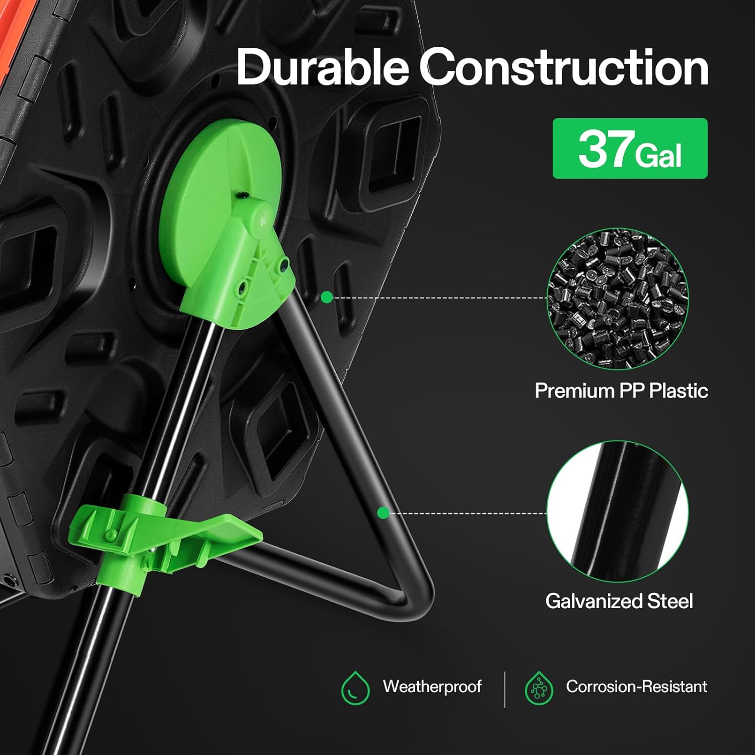 - Efficient Aeration: The well-designed air vents and deep fins accelerate air circulation by breaking up clumps inside the chamber and mixing oxygen throughout the compost; The removable door is large and separated, making it convenient to add your waste or remove the finished compost; Also comes with a lock braking system for stable use