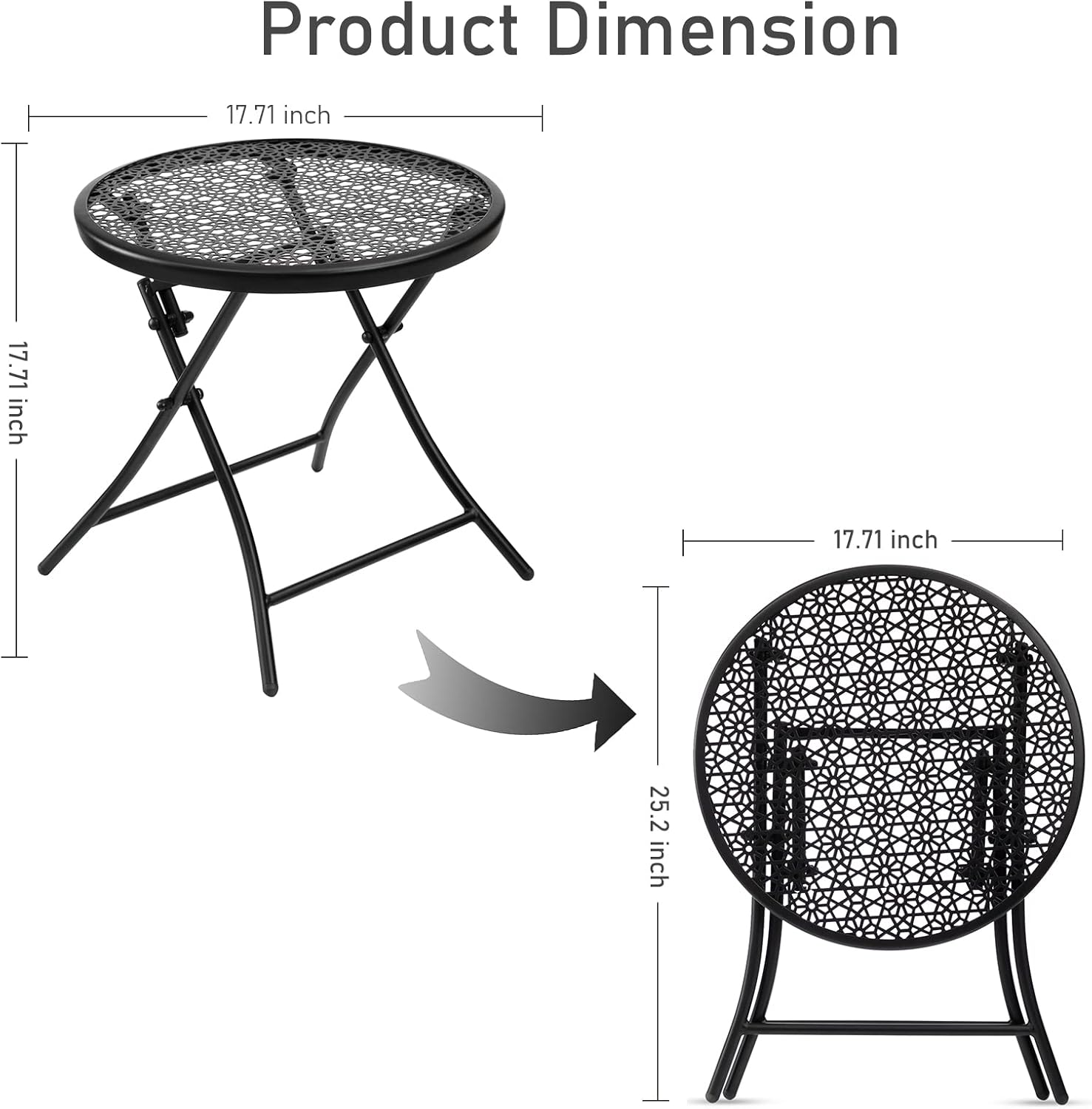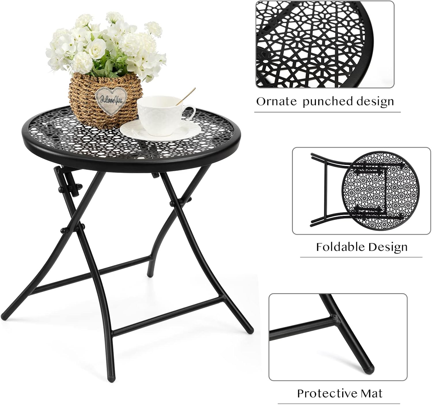 TeoKJ Folding Outdoor Side Tables, Anti Rust Small Patio Table Round Metal Nightstand with Flower Cutouts for Porch Yard Balcony Deck Lawn, Black
