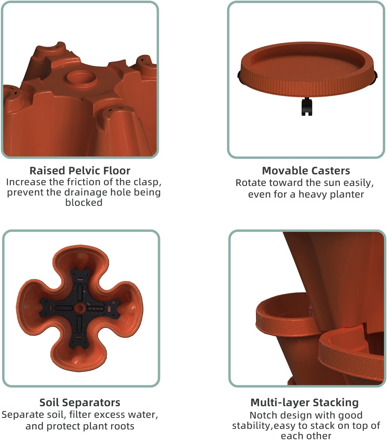 Strawberry Stackable Planter, Vertical Tower Garden, 5 Tiered Stacking Herb Vegetable Planters with Movable Casters and Bottom Saucer Indoor and Outdoor - Terra Cotta