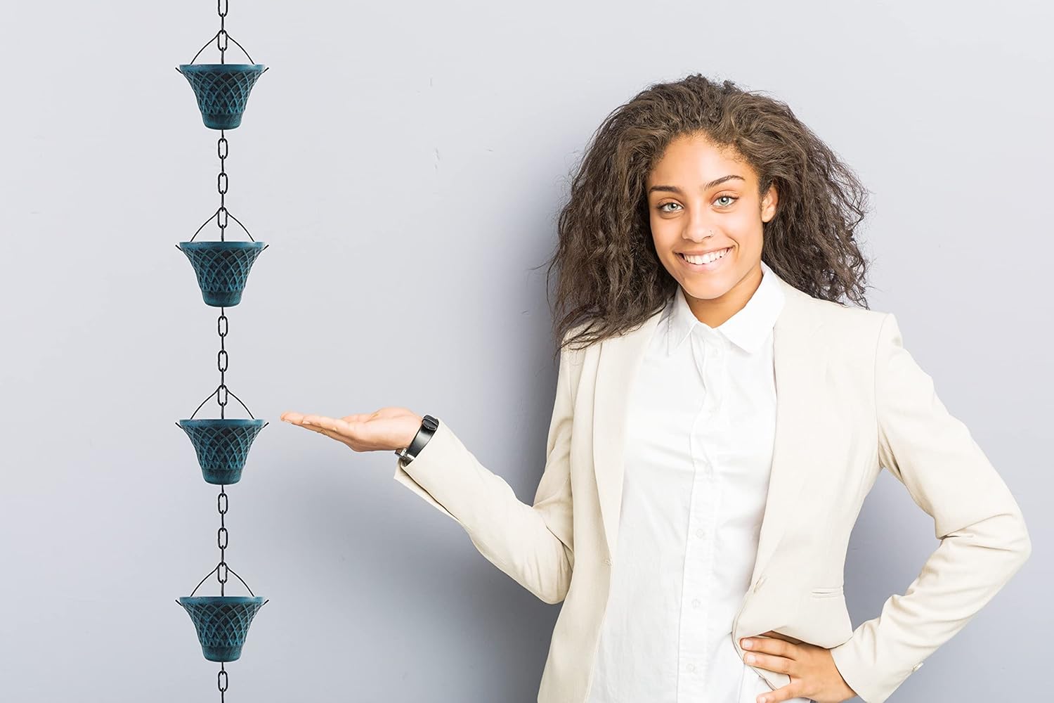 - EXQUISITE DESIGN: Featuring 12 beautifully ornate bell cups, our rain chain adds a chic touch to your roof, awning, or shed. Moreover, the rain chains are painted sky blue on the outside and inside, to perfectly complement your roof and garden décor.