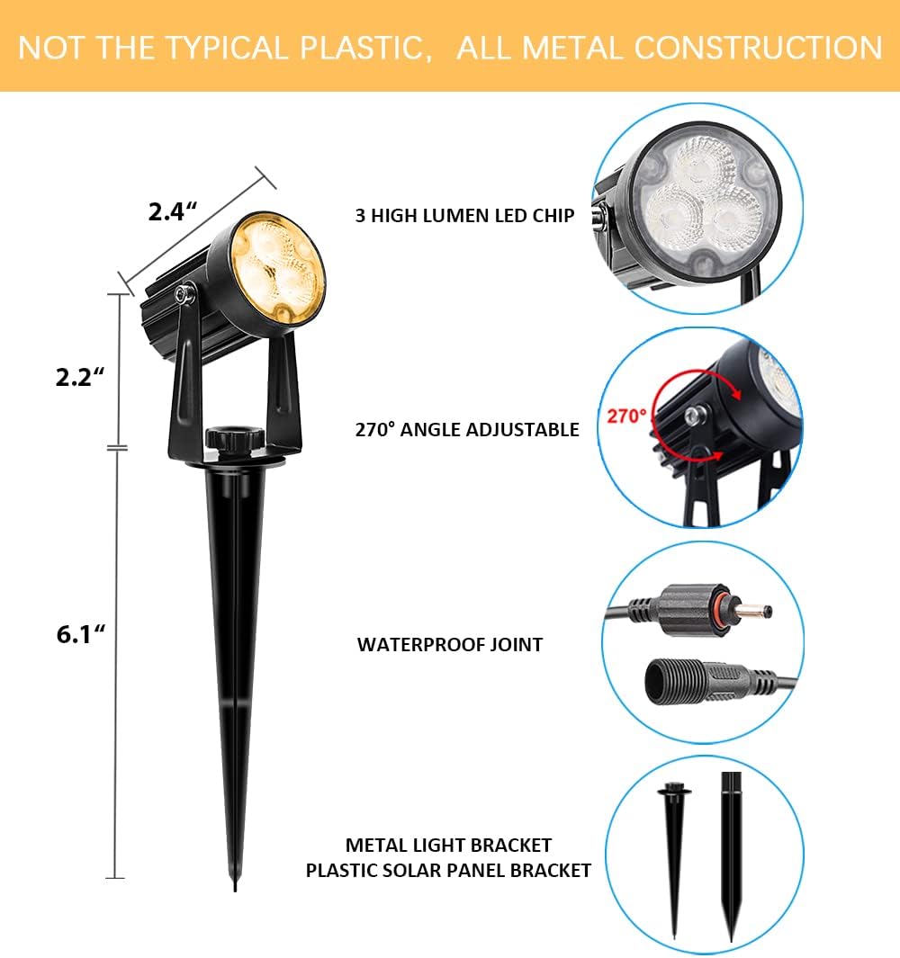 - 【2 installation methods】Easy to install:The solar panel and outdoor solar landscape lights can be installed in the ground or mounted on the wall with included screws. Each solar garden spot lights with 118inch/3m cable, 270° Adjustable freely up or down to meet different requirements