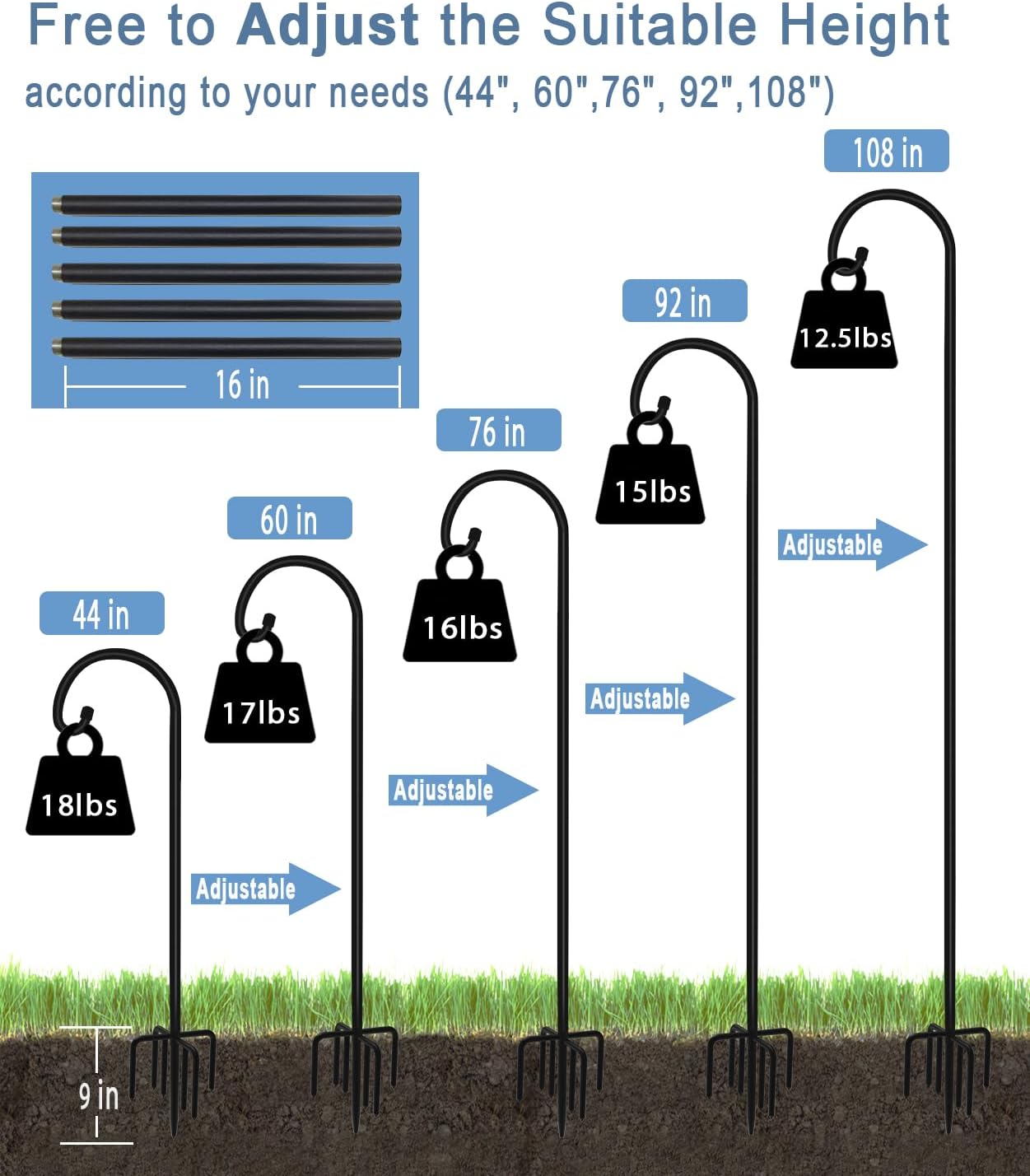 - Extendable & Tall Hook Hanger: The outside shepherd’s hook hanger made of 3/5 inch width & 2mm thickened steel pipe with 7 solid anchor points, you can free to adjust the suitable height for 108", 92", 76", 60" or 44", and also make it stands firmly in the ground without easily falling down, no fear of severe weather such as strong winds, heavy rains, and blizzards, (1 PACK / SET)
