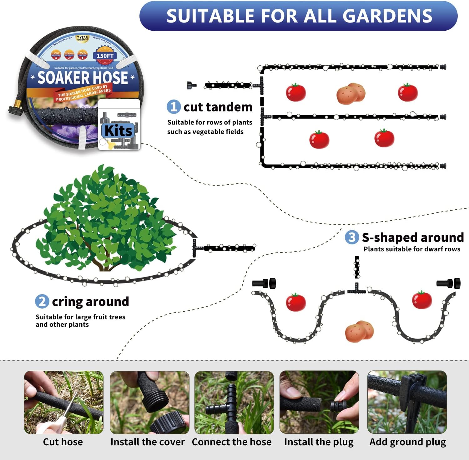 - DIY Hose Length with Kit – We provide different size soaker hose and kit for our customers with different requirement. If your garden are not large enough, you can choose 2 pack 25ft soaker hose. Also, they can be connected to be a 50-foot soaker hose. If you have a large garden beds, 100 ft or 150 ft soaker hose would be better choice. Long soaker hose package including some hose accessories, which can be used to DIY new length hoses as you need.