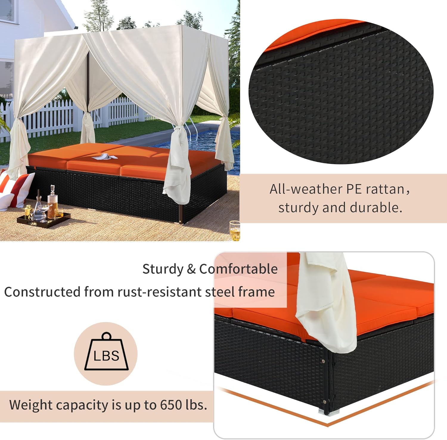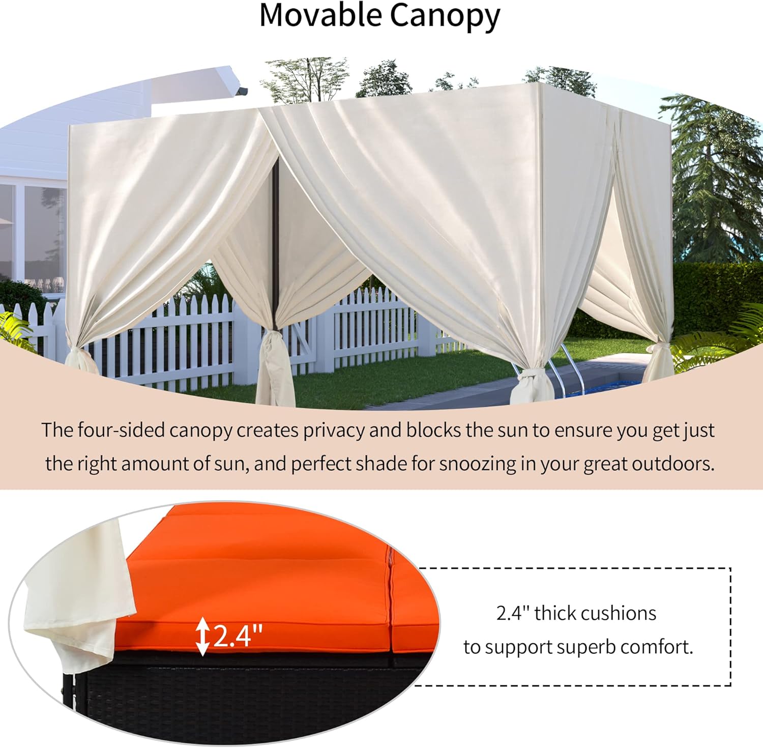 Patio Chaise Lounge, PE Rattan Outdoor Patio Wicker Sunbed Daybed with Adjustable Seats, Four-sided Canopy, Overhead Curtain and Orange Cushions for Backyard, Garden, Poolside (for 2-6 people)