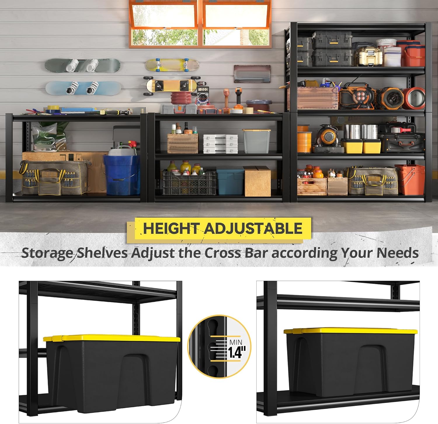 - Garage Shelving with Strong Weight Capacity: Made of all heavy duty metal, this 5-tier metal shelving holds 500 lbs per shelf when evenly distributed and 2500 lbs in total, perfect for loading heavy items in all scenes. Differ from wood boards, REIBII shelves for storage will not break and fall apart, with no chemical material used, this garage shelving units and storage stays durable and sturdy as well