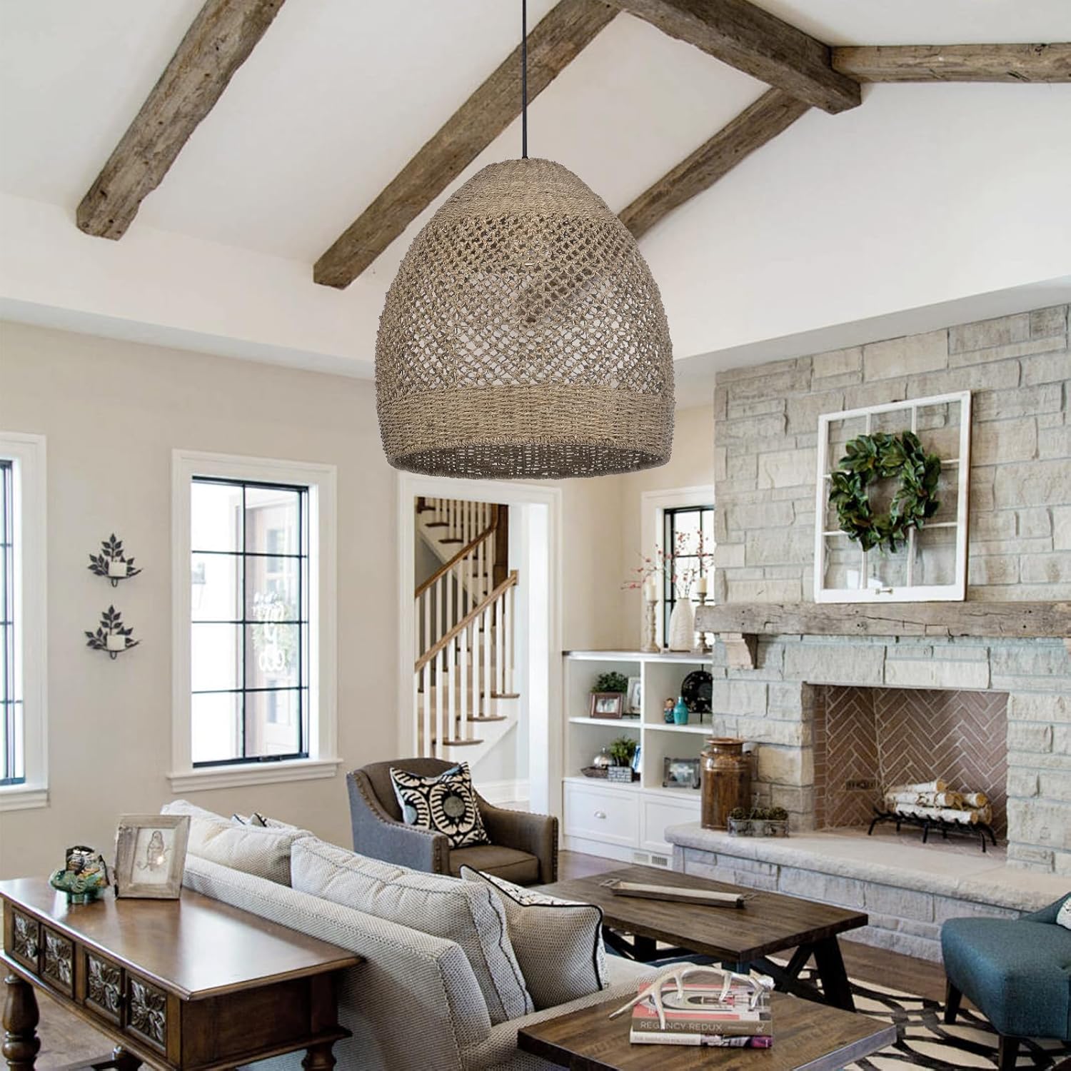 Arturesthome 19.6" Retro Rattan Woven Pendant Light Fixture, Chandelier with Lamp Shade Light Cover, Hanging Lighting for Kitchen Dining Room Foyer