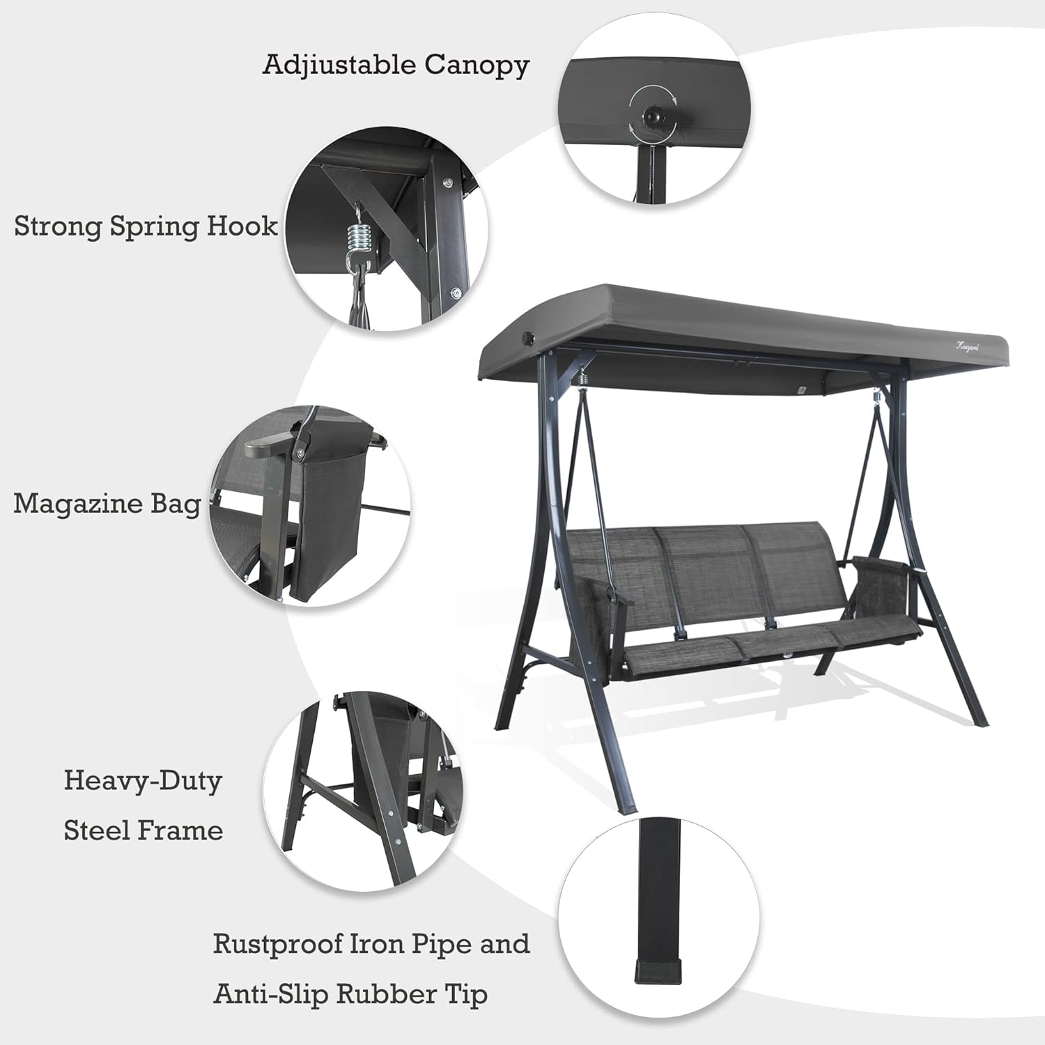 - ✅3 Person Seating Capacity - This porch swing with canopy has a comfortable, long bench seat design with room for three. Suitable as an outdoor swing chair, garden swing, backyard swing, lawn swing, patio swing chair, deck swing, or a yard swing.