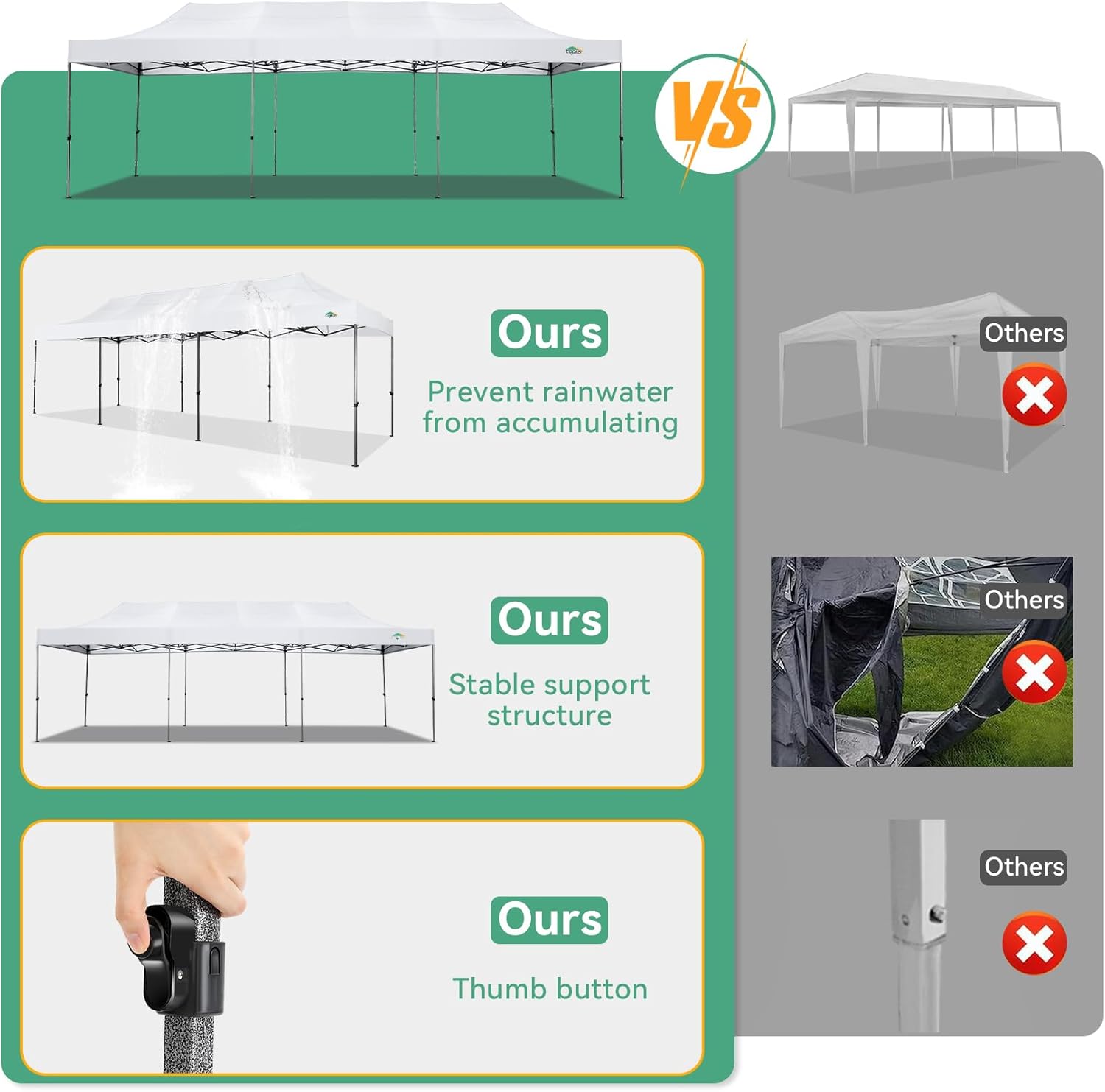 - 【Easy Set up, 3 Adjustable Heights】2-4 people can easily set up and take down 10x20 outdoor party tent canopy in minutes without tools, it can easily accommodate 20-25 people. Just remove the fully assembled frame and top from bag, place fabric over frame, stretch legs, and you're done. Wedding tent gazebo is available in 3 different heights (86.6'', 90.5'', 94.5'') for your choice to ensure adequate headspace. Best thumb latch system is easy to lock and release without pinching your fingers.