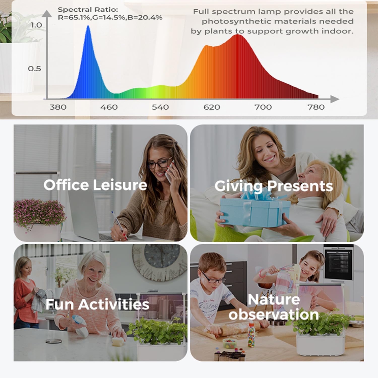 - 【Smart Hydroponic Growing System】This updated indoor garden kit is smarter. Three lighting timer settings for different grow stages:[12h on, 12h off; 16h on, 8h off; 24h on] Two brightness settings [100% & 50%] for different plant lighting requirements. Two self-watering pump modes for different growth stages and temperatures [on 1h, off 3h; 24h on] we advise 24h on when Temp > 30℃ or 85°F.