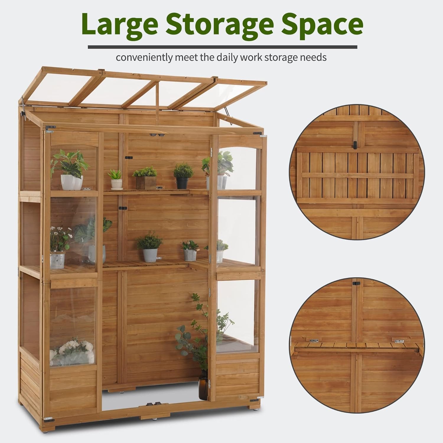 - Fir Wood: The wooden greenhouse is made of high-quality pure fir wood, and the exterior has been polished to express a rustic style. Medium brown blends easily with other décor and natural settings