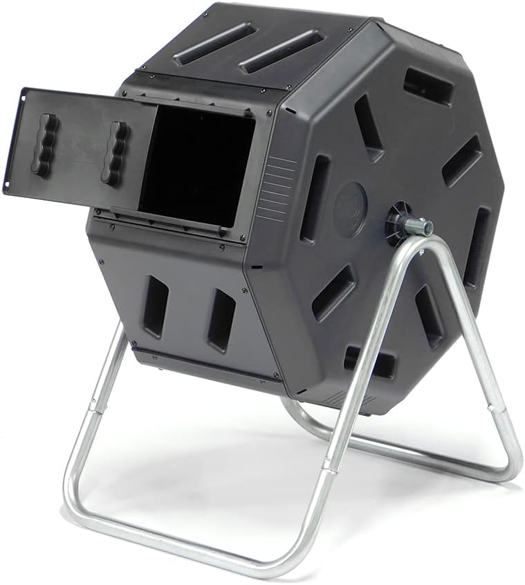 - TUMBLING COMPOSTER β Avoid digging and mixing your compost pile by hand. The tumbling design makes mixing easy and efficient. Just close the door and turn it 5-6 times every 2-3 days. In hot sunny conditions and with a proper balance of ingredients the compost can finish in as little as 2 weeks. Total capacity approximately 22.5 gallons (3 cu ft)