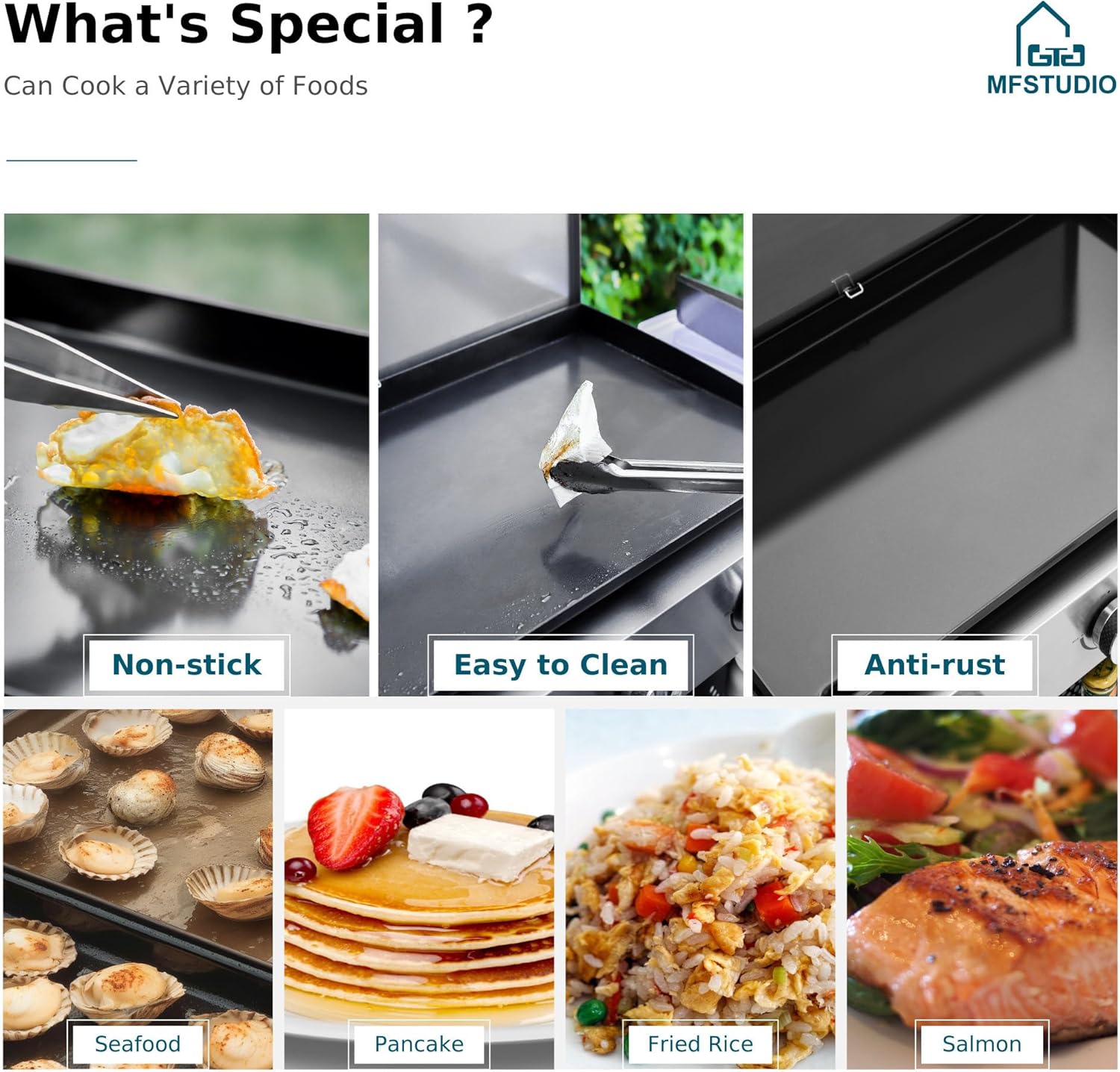 MFSTUDIO 27 Inch Flat Top Propane Gas Griddle Grill, Ceramic Coated Cast Iron Pan, Outdoor Flattop Grill with Lid for Cooking