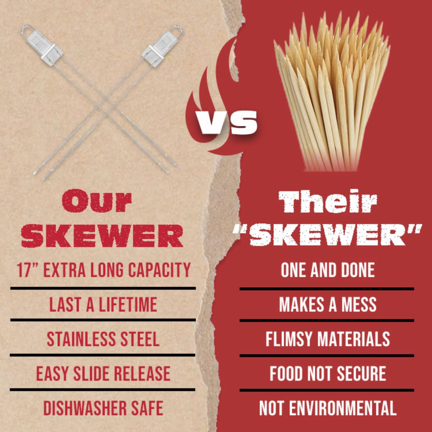- Keep food on the Skewer: Our double-pronged and flat design will keep your food on the skewers. If you're tired of having skewers where the food is always falling off, you must own the BBQ-AID Skewers!