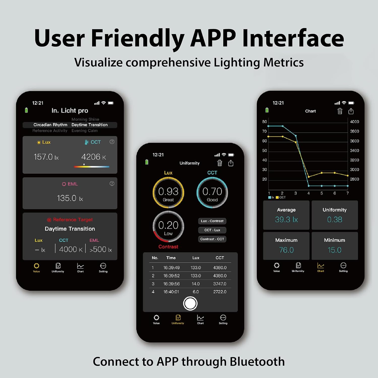 - [Well Performance Index] 6-in-1 Light Measurement provides data of Illuminance, CCT (Color Temperature), EML, Visual Contrast, mEDI and Uniformity. You can create optimal lighting for various needs, from photography to healthy workspaces.