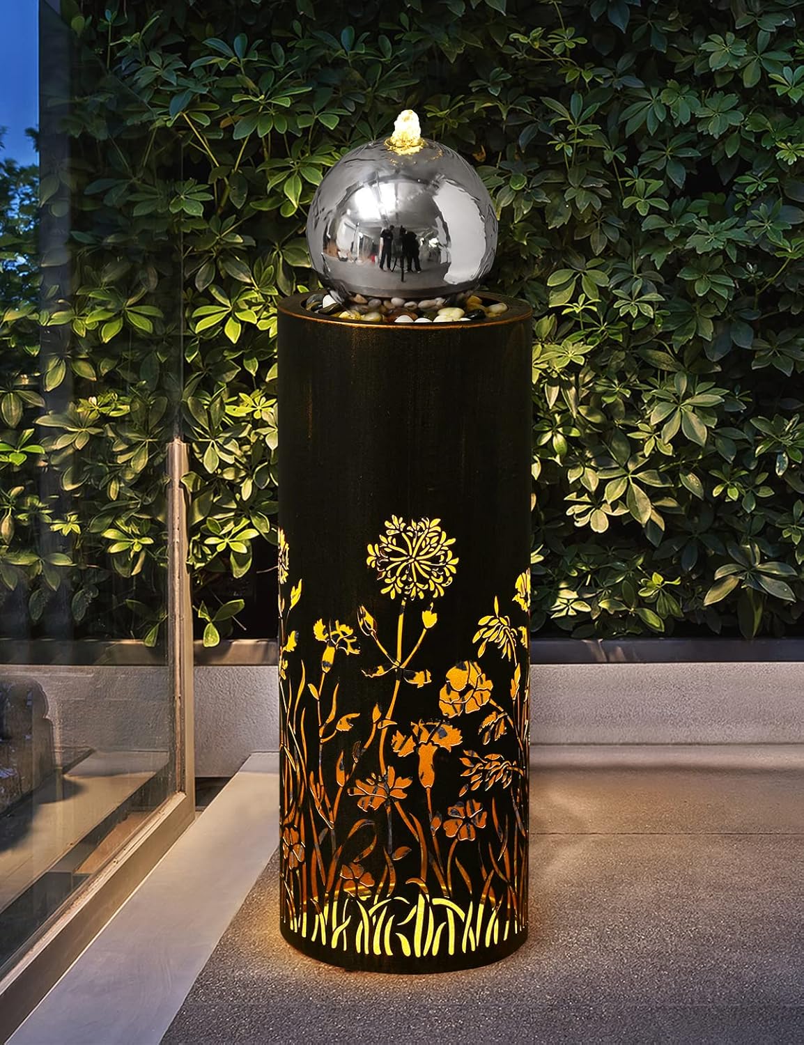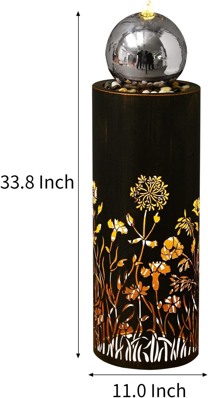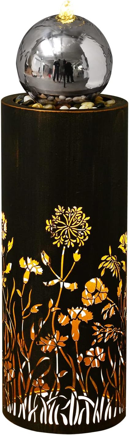 - EXCELLENT DESIGNE: Water fountains outdoor -hollow carved flower match modern ball with LED lights,seems bloom a sea of flowers in the night,brings life and vitality to people,your living room office choice.
