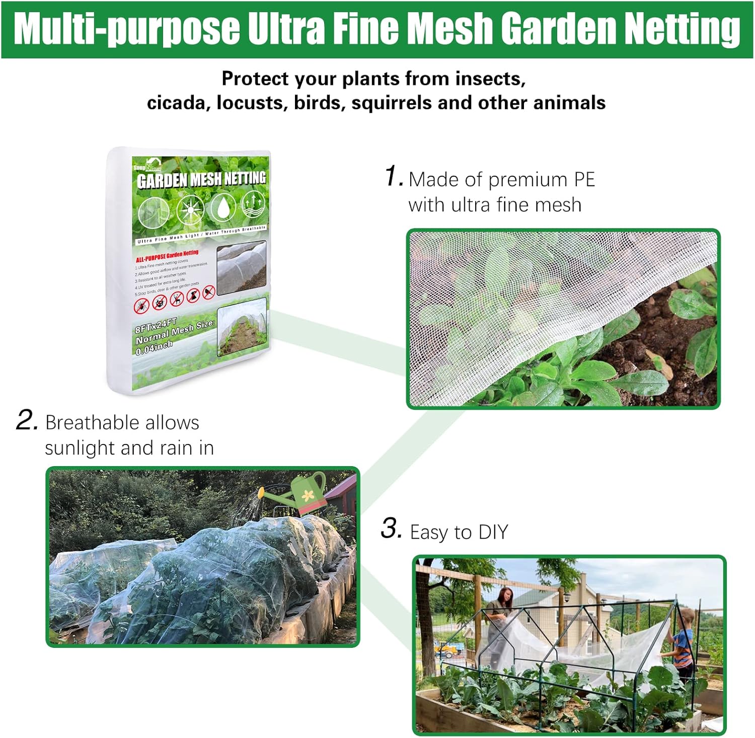 - Ultra-Fine Mesh Netting: Large size 8x24 feet provides more security. Ultra fine garden netting has a 0.8mm x1mm ultra-fine mesh, effectively protects vegetables, fruits and flowers.